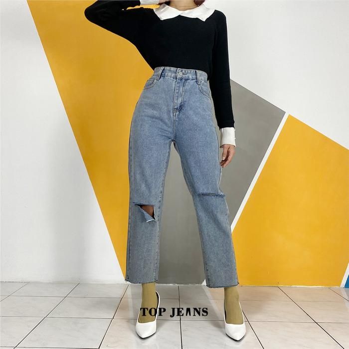 Celana Jeans Panjang Model Sobek Wanita Pinggang Tinggi Gaya Kekinian TJS P205 - BIRU M