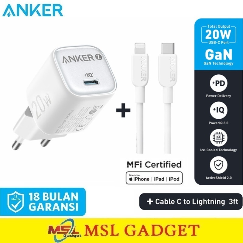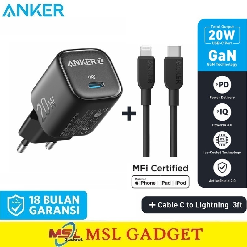 Anker Zolo Charger iPhone 20W GaN USB Type C + Kabel C to Lightning MFI PD Fast Charging