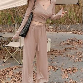 Basic One Set V Neck Long Sleeve Top + High Waisted Soft Wide Leg Pants Wanita 1750 (S/M/L/XL) - Cream S Standar