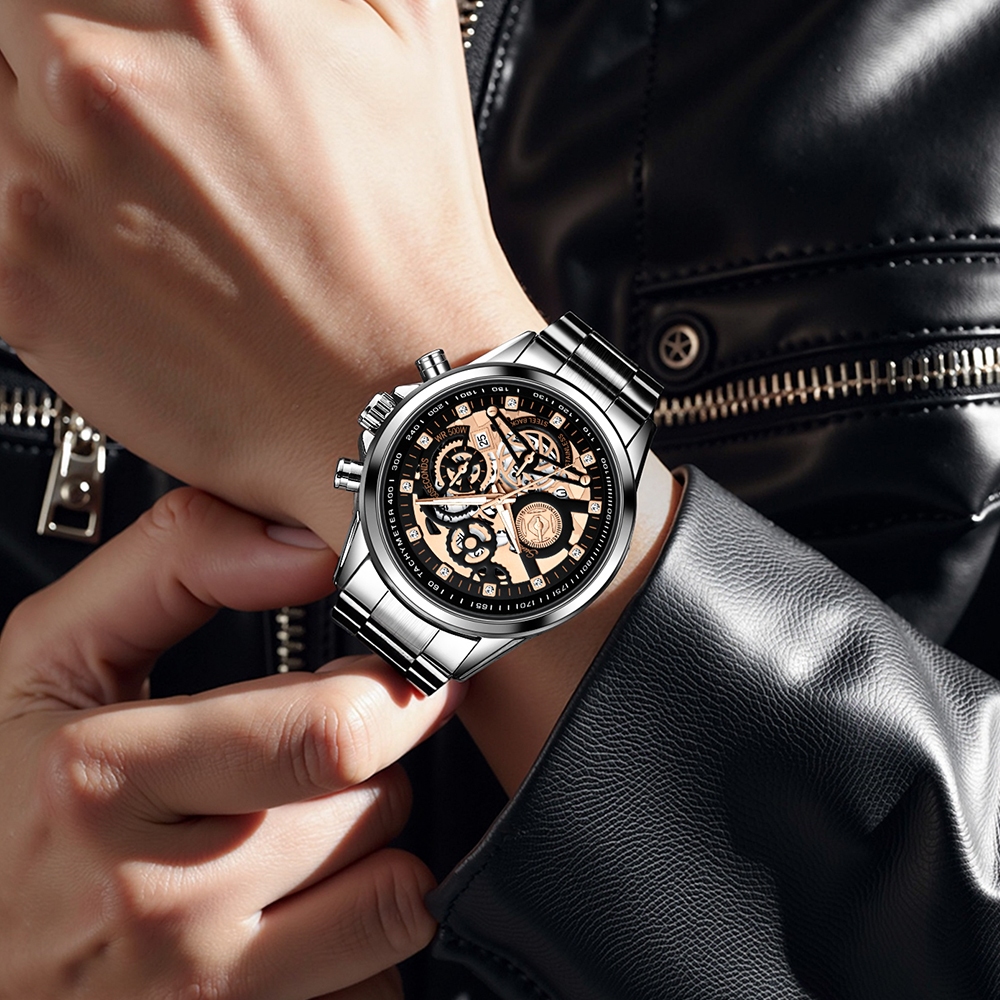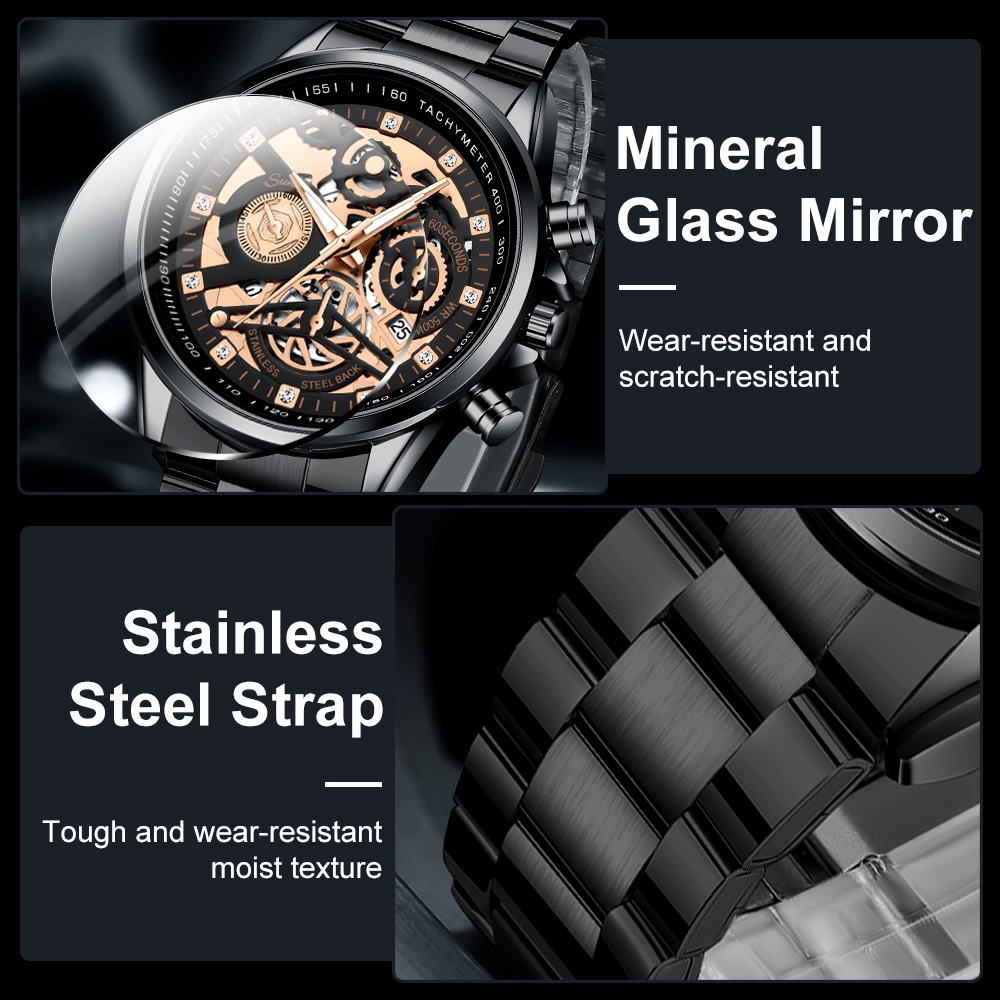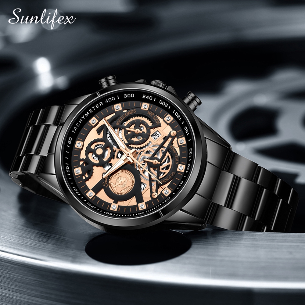 Sunlifex Jam Tangan Pria 3352 Bercahaya Dial Berongga Santai Mode Tali Stainless Steel Kalender Jam Tangan Cowok