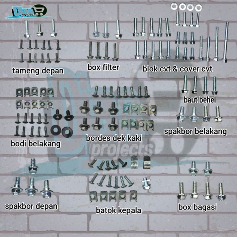 Dek kaki, Batok kepala, Fulset Bodi+blok cvt, Baut body lengkap, Blok cvt+cover cvt, Body belakang, Tameng depan