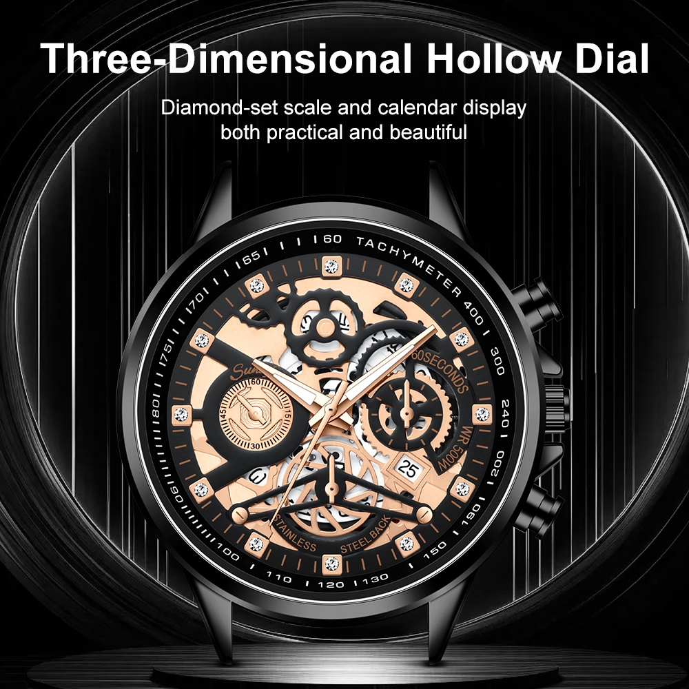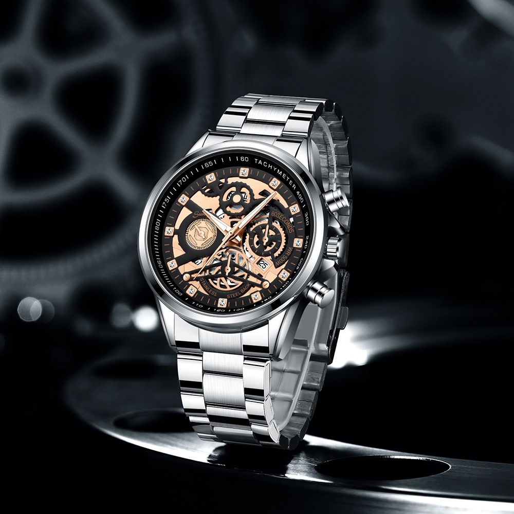 Sunlifex Jam Tangan Pria 3352 Bercahaya Dial Berongga Santai Mode Tali Stainless Steel Kalender Jam Tangan Cowok