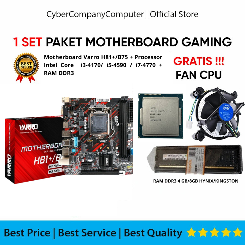 Paket New Motherboard Varro H81 DDR3 Core i3-4170/ i5 4590 / i7-4770 Socket 1150 HDMI NVME Sata 3.0 Gen 4