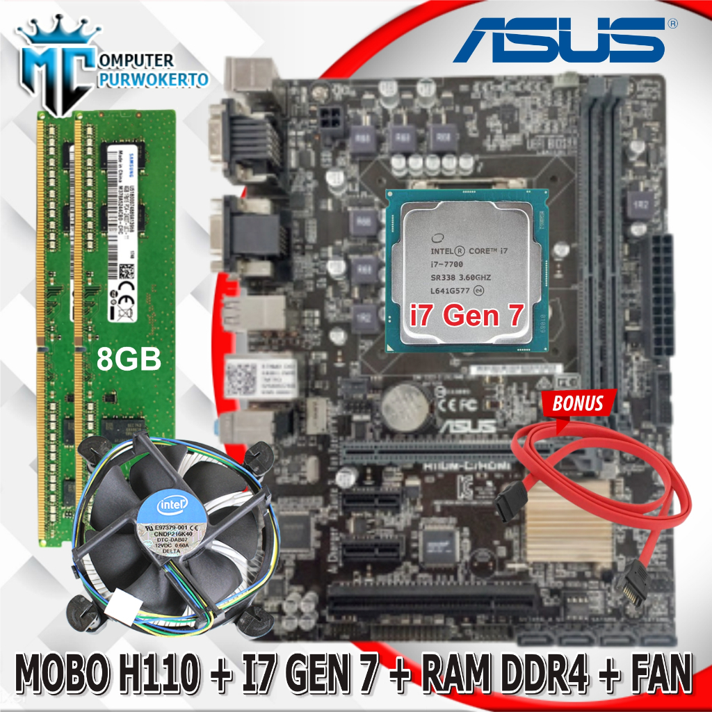 Paket Mainboard Mobo Intel LGA 1151 H110 + Processor i7 7700 Gen 7 dengan RAM DDR4 dan Fan