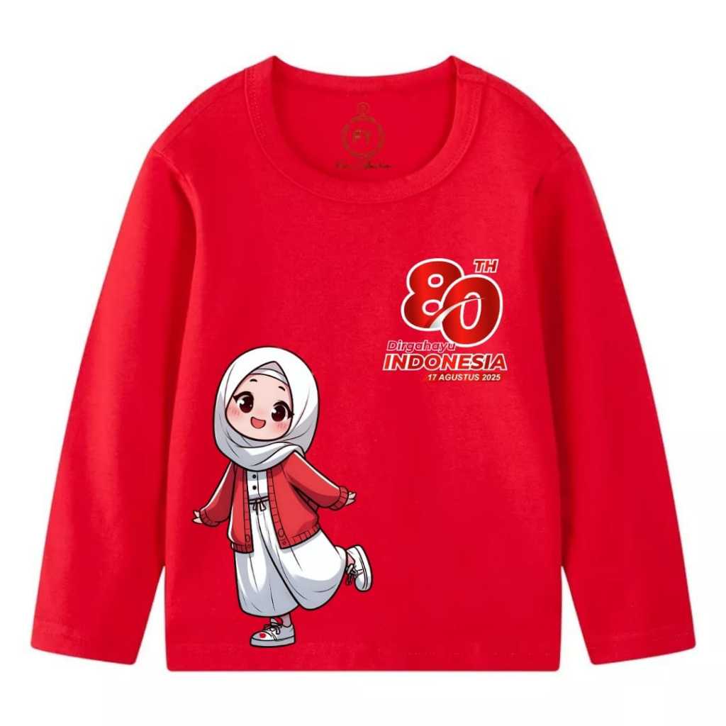 Atasan LP Baju Kaos Pakaian Lengan Panjang Kemerdekaan Perempuan Gambar Anak Berhijab Terbaru 80th