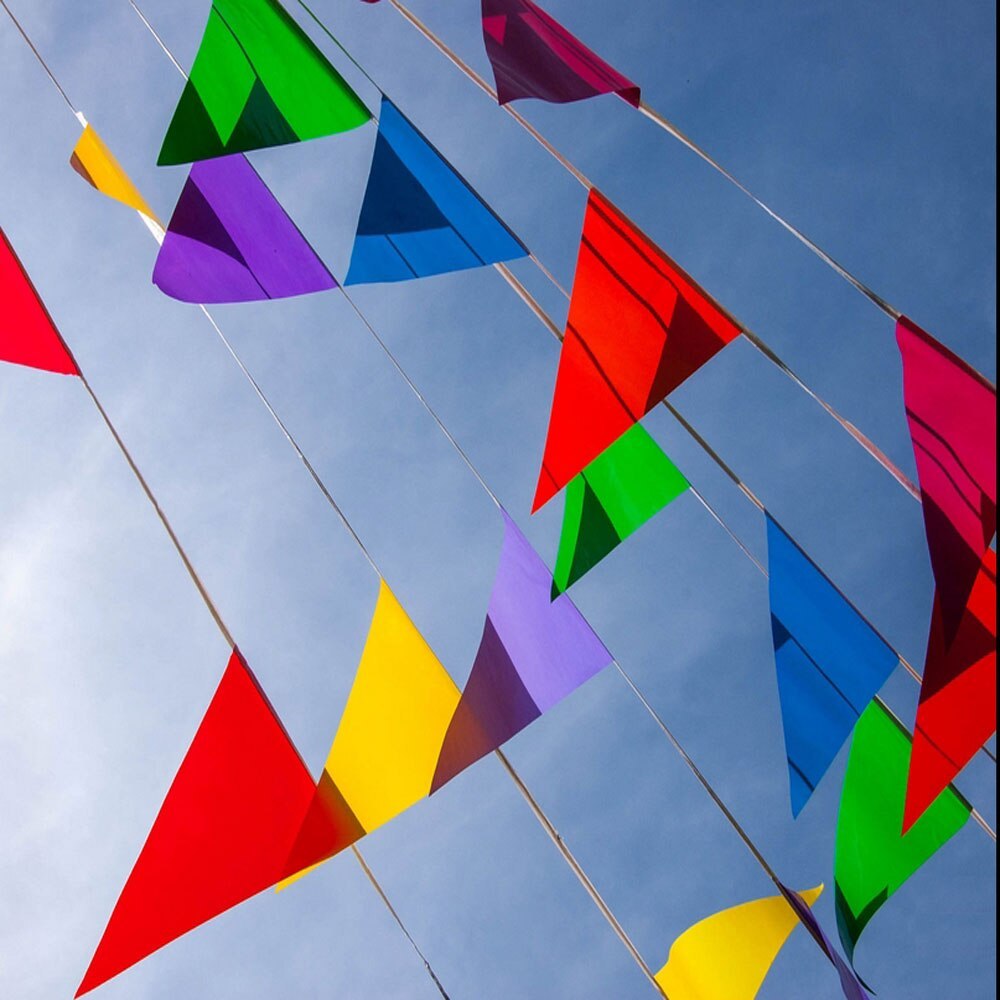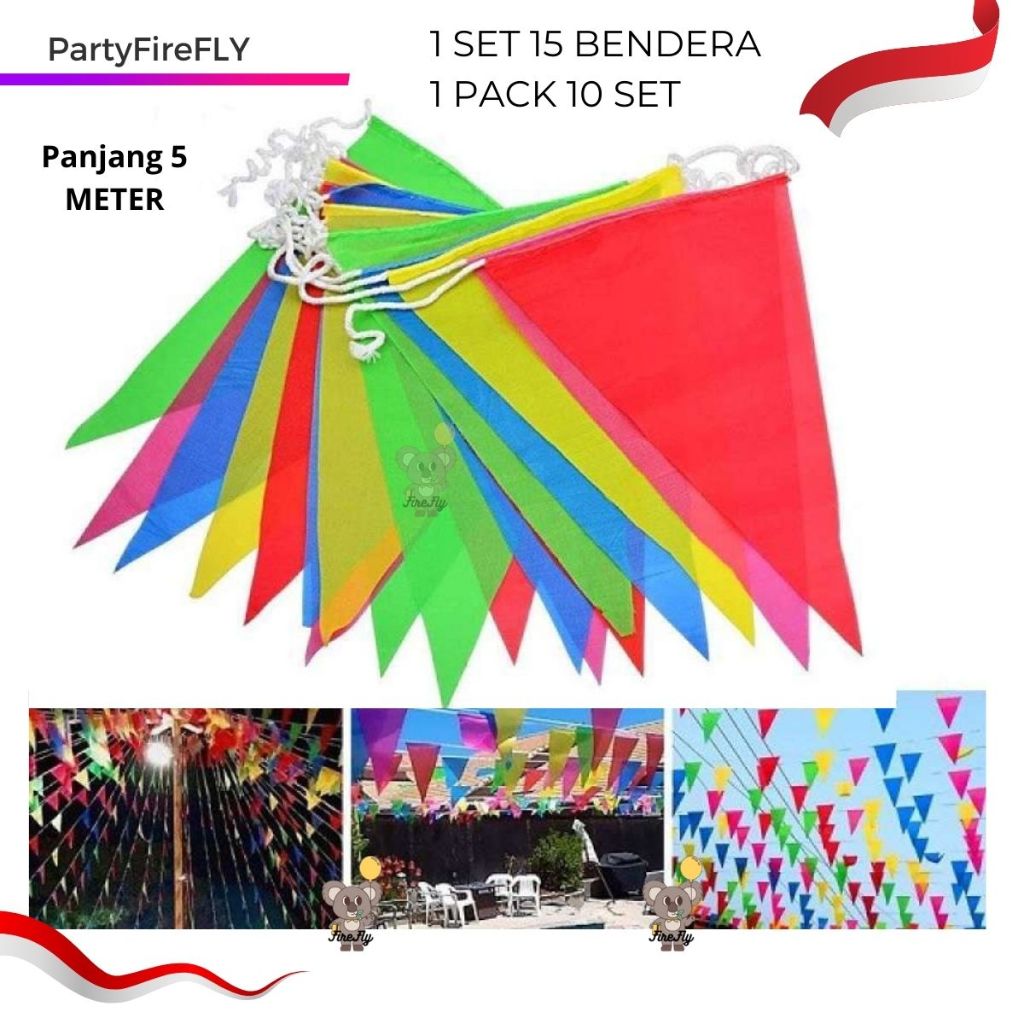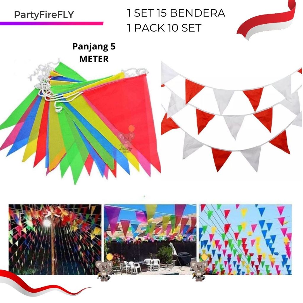 Bendera Segitiga Kain Warna-Warni / Flag Party / Bendera Segitiga kain poliester / bendera karnaval 5 METER /10 SET GROSIRAN KARNAVAL Merah Putih