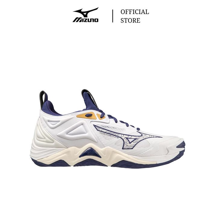 TERLARIS MIZUNO SEPATU VOLLEY WAVE MOMENTUM 3 WHITE BLUE RIBBON MP GOLD MIZV1GA231243