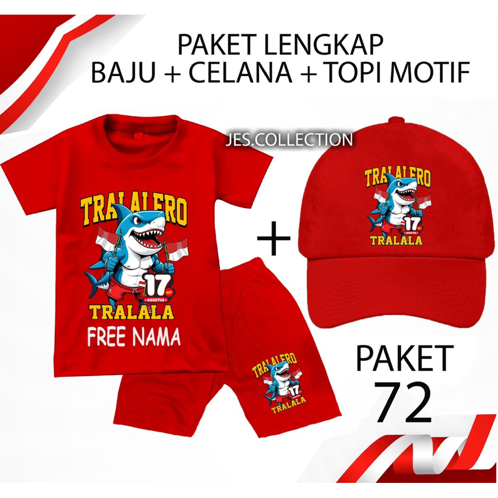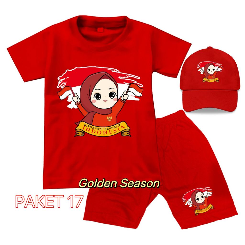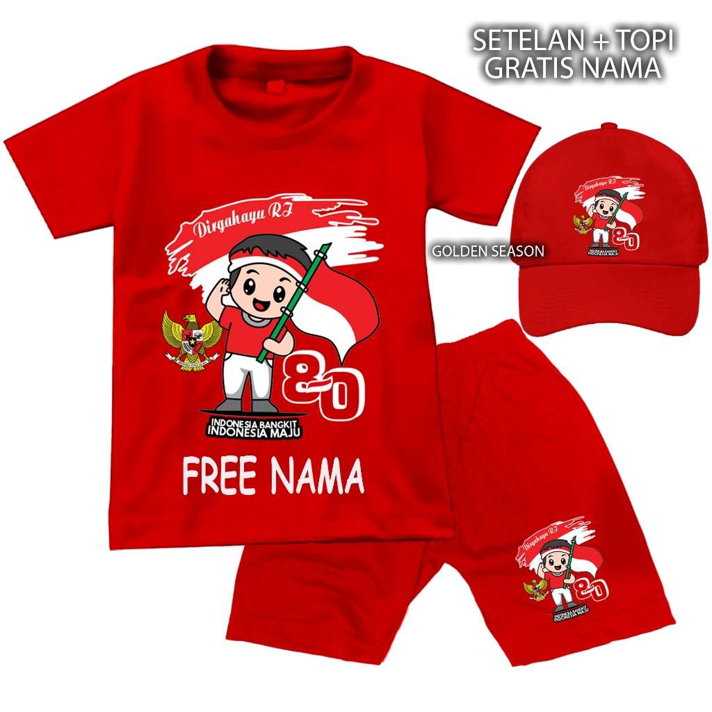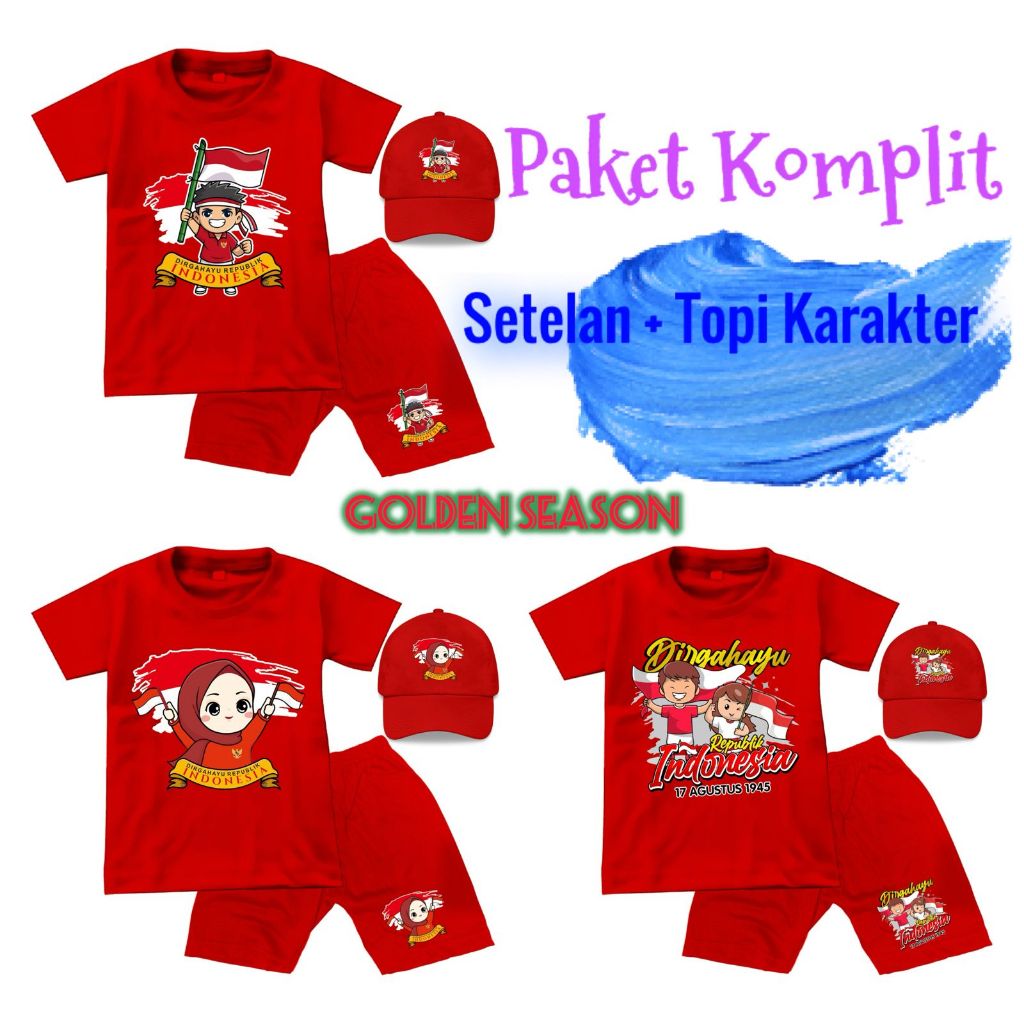 [Paket Komplit FREE NAMA] Setelan + Topi Sablon Motif Anak Tema Agustusan HUT RI Kemerdekaan