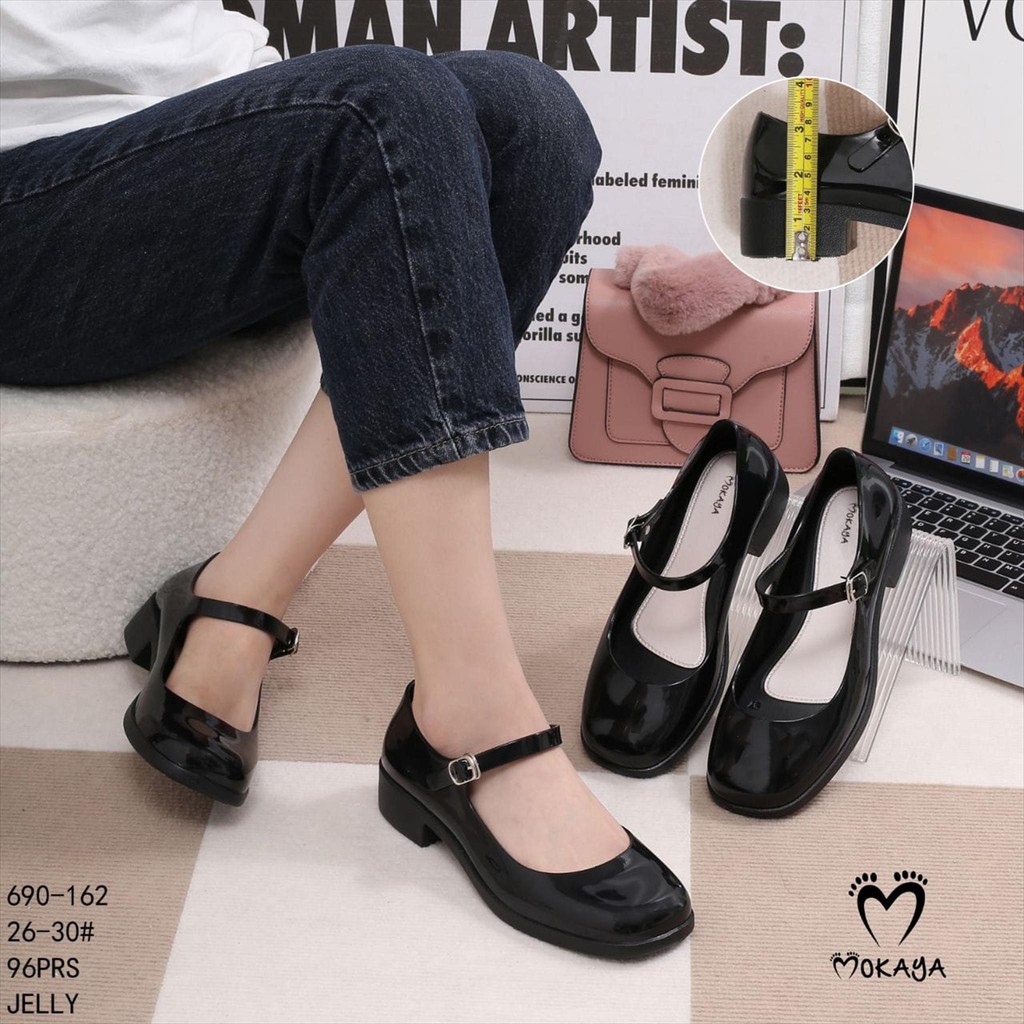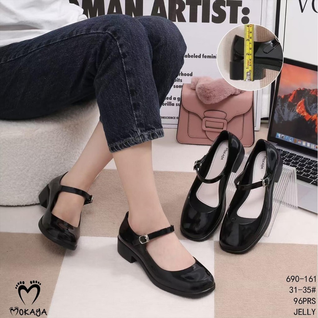 Sepatu Jelly Pantofel Wanita dan Anak Cewek Paskibra Hitam Glossy Formal Kantor Tali Gesper Kotak Kecil Super Mewah Eleg