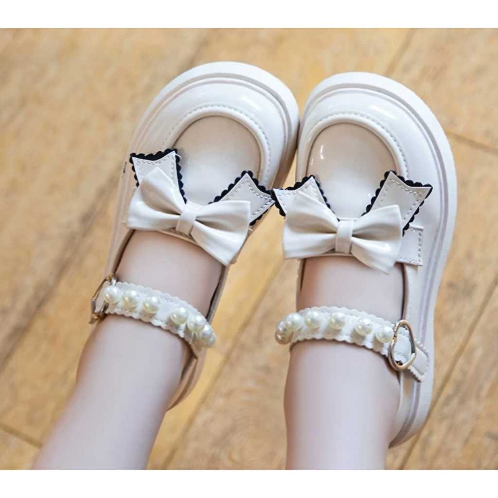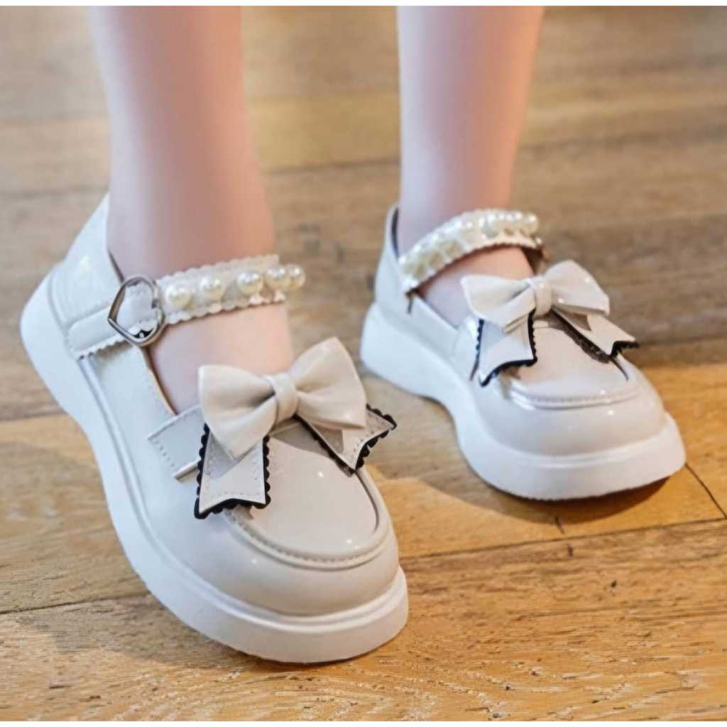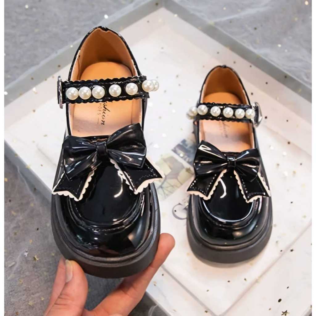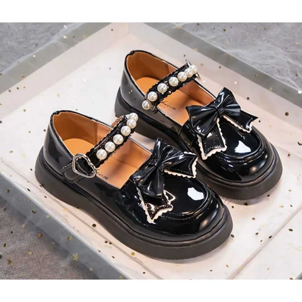 Jejak Sepatu Anak Sekolah Cewek Perempuan Dockmart Pita Mutiara Hitam Putih (700)