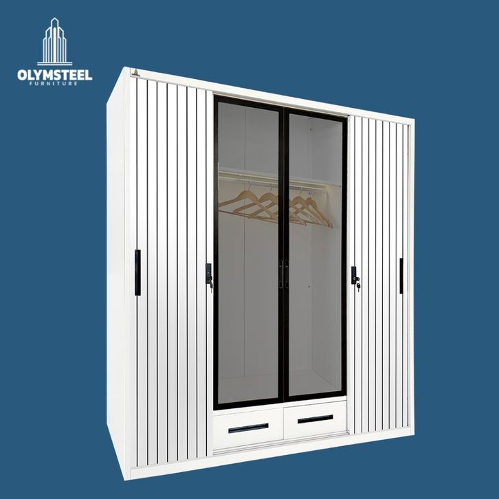 MORE Olymsteel Lemari Pakaian Besi Sliding 4 Pintu 2 Laci Tempered Glass / OSWS 4P2L TG Freya