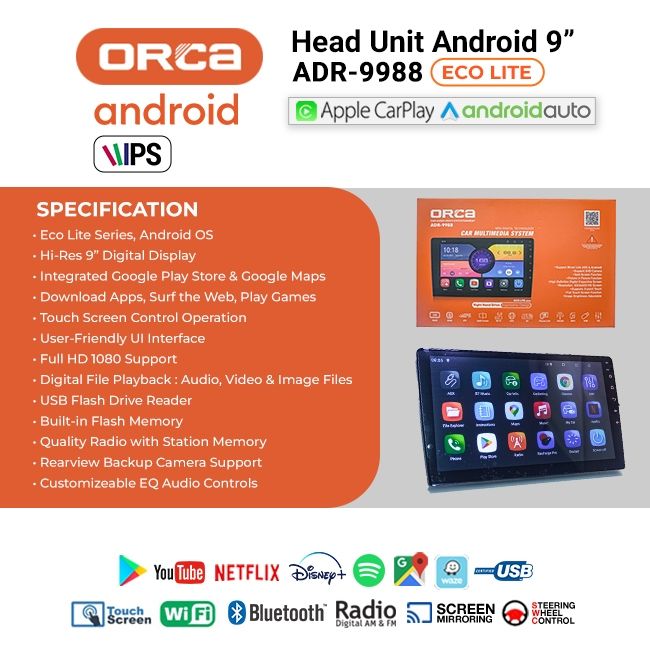 Head Unit TV Android 9 / 10 ″ inch ORCA ADR-9988 ECO LITE Support Android Auto & Carplay 2GB/32GB
