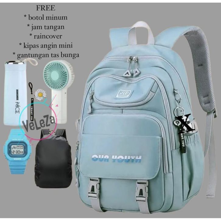 TAS SEKOLAH RANSEL ANAK PEREMPUAN REMAJA SD SMP MODEL OURR YOUTH GRATIS BOTOL MINUM KACA JAM TANGAN RAINCOVER KIPAS ANGI