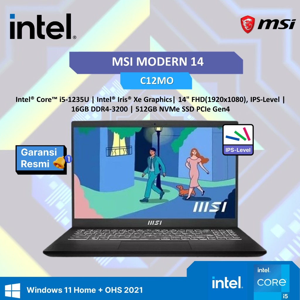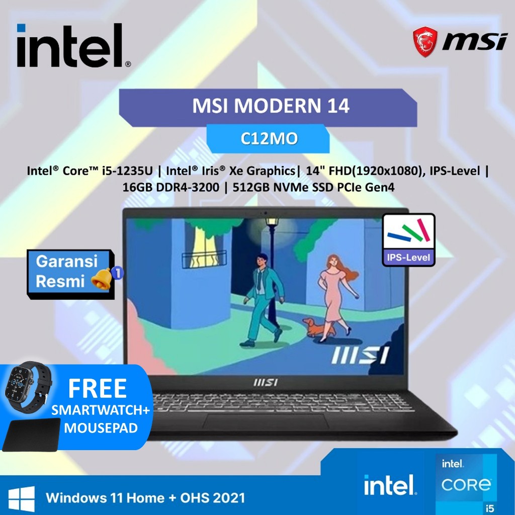 Laptop MSI Modern 14 I5 1235 16GB 512GB W11+OHS 14.0FHD Ips Blit 2Y Slv -C12mo-1282 Garansi Resmi