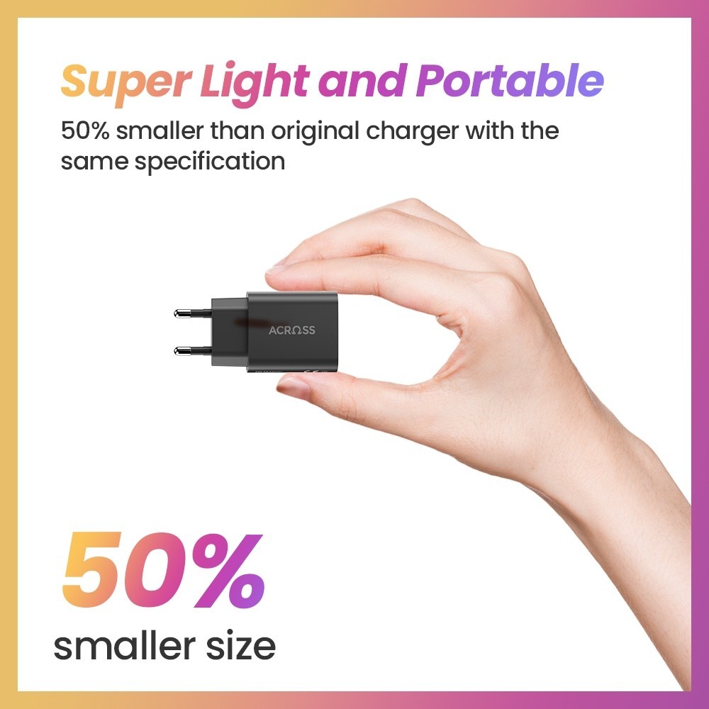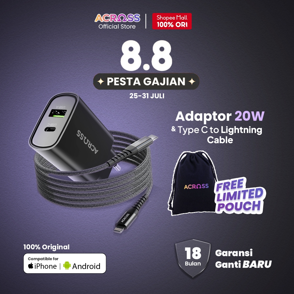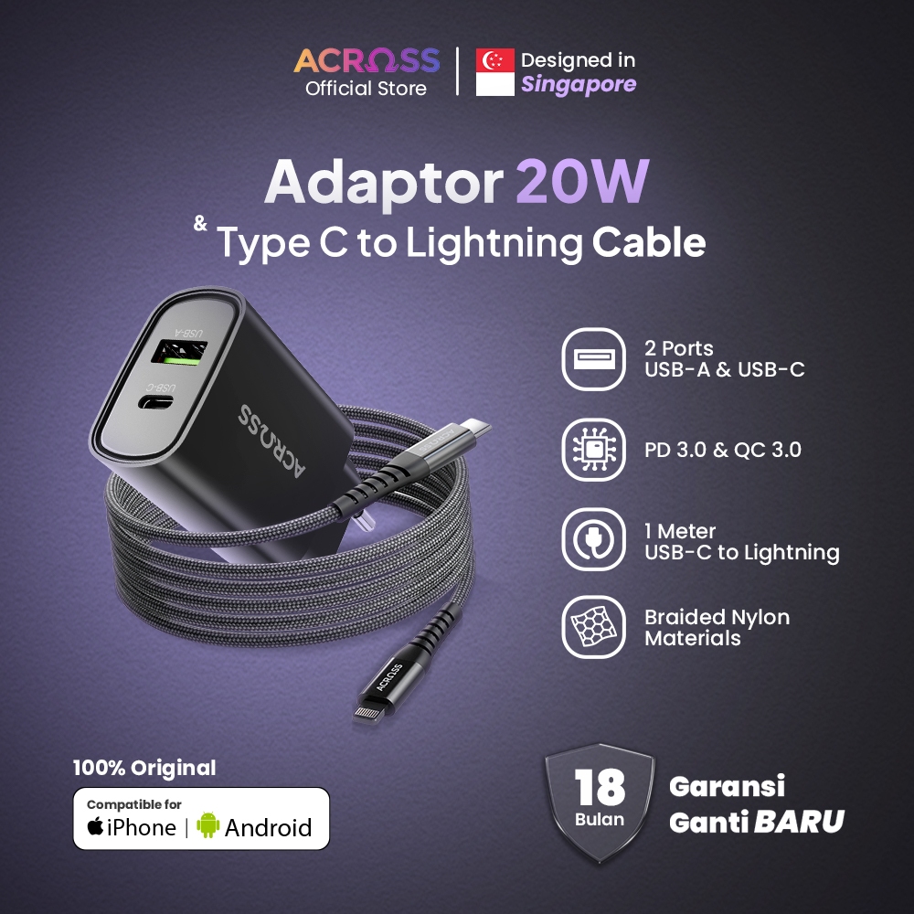 ACROSS Bundle Kepala Charger 20W Adaptor Fast Charging Black + Kabel Data Type C to Lightning 21W Charger IPhone MFi Bla