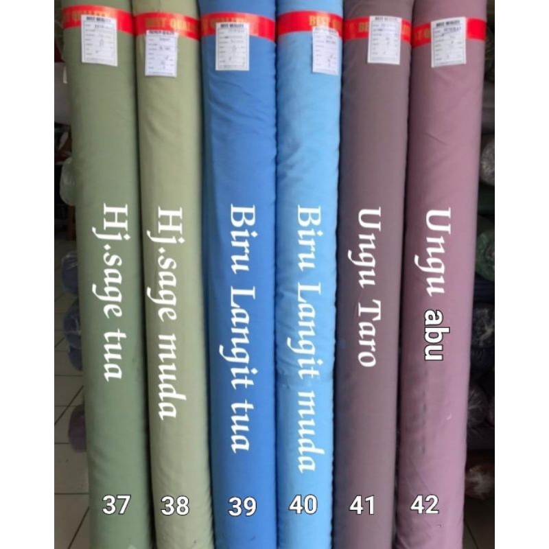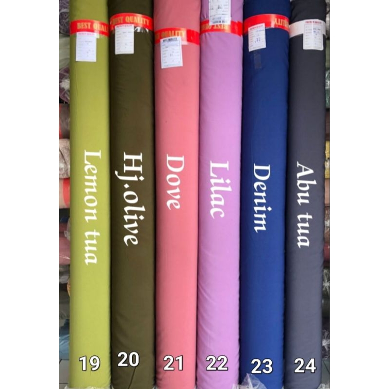 Hitam, Putih, Maronn, Nevy, Hijau Tua, Hijau botol, Sage tua, Sage muda, Warna sesuai chat, Warna lain chat, Hijau wardah, Biru wardah, Hijau toska, Toska muda, Toska medium, Coksu, Mocca, Crem, Cokelat Tua, Kubus mustard, Salem, Peach, Pink fanta, Magenta, Putih tulang, Abu Tua, Abu muda, Ungu Tua, Ungu terong, Lavender, Lilac, Mint, Denim, Benhur, Biru mint, Biru langit, Merah bata, Turqis, Milo