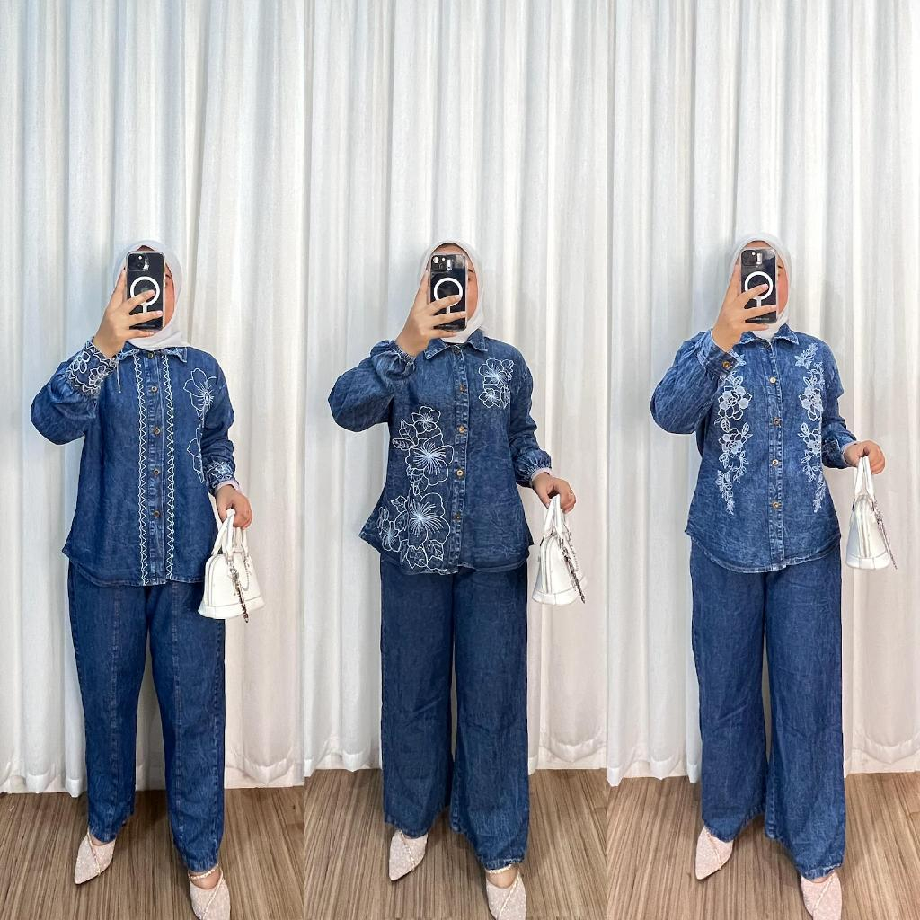 Fisya Fashion Stelan Jeans Kemeja Denim/Oneset Jeans Kemeja Wanita Model Terbaru Korean Style