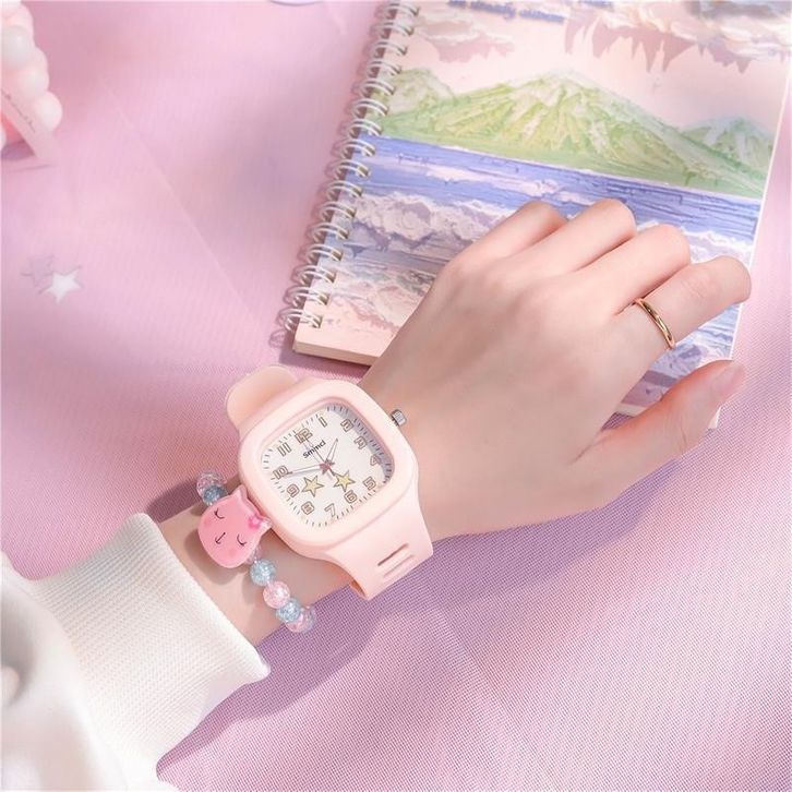 TERBARU Jam Tangan Kuarsa Wanita Kasual Bintang Grafiti Penunjuk Persegi Dial Besar Tali Silikon Jam