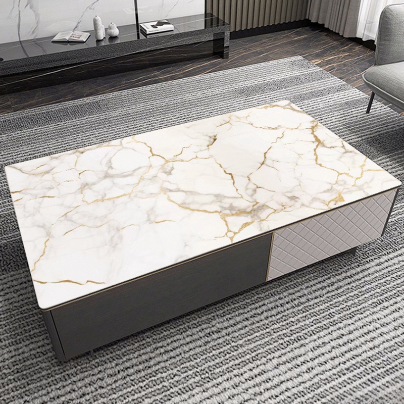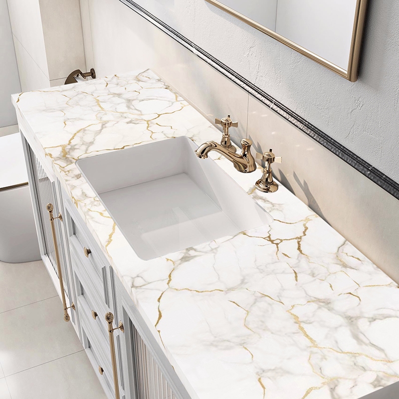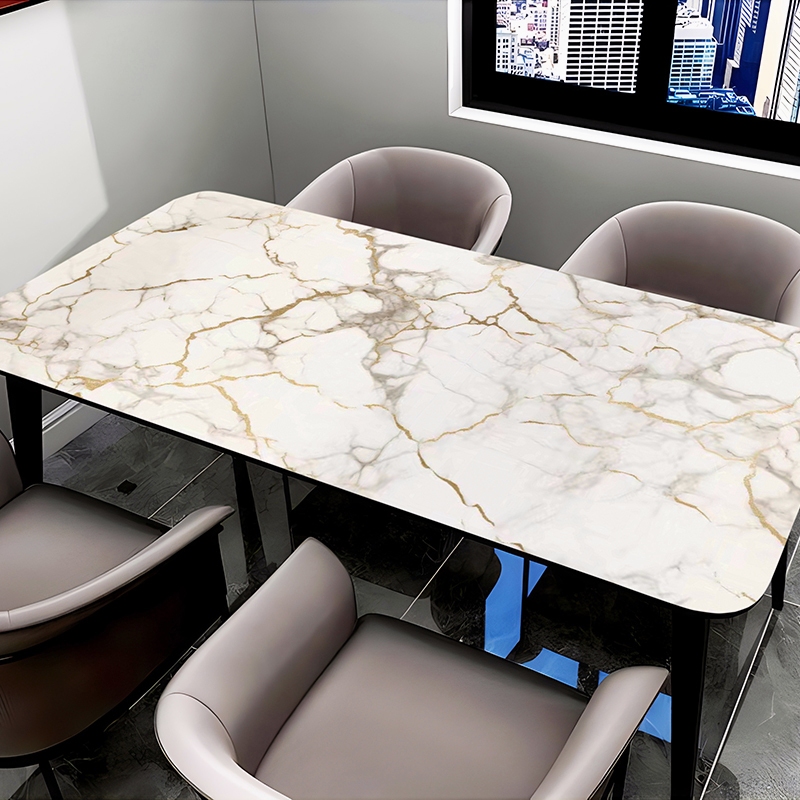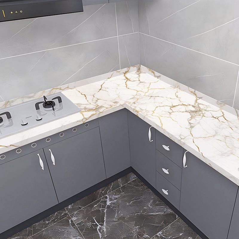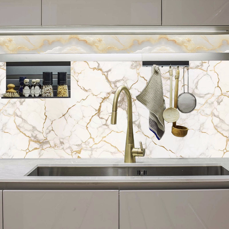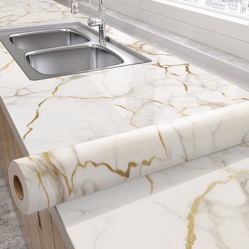 wallpaper dinding dapur 6 meter X 60cm alumunium foil motif marmer dasar putih corak abu2 dan kuning