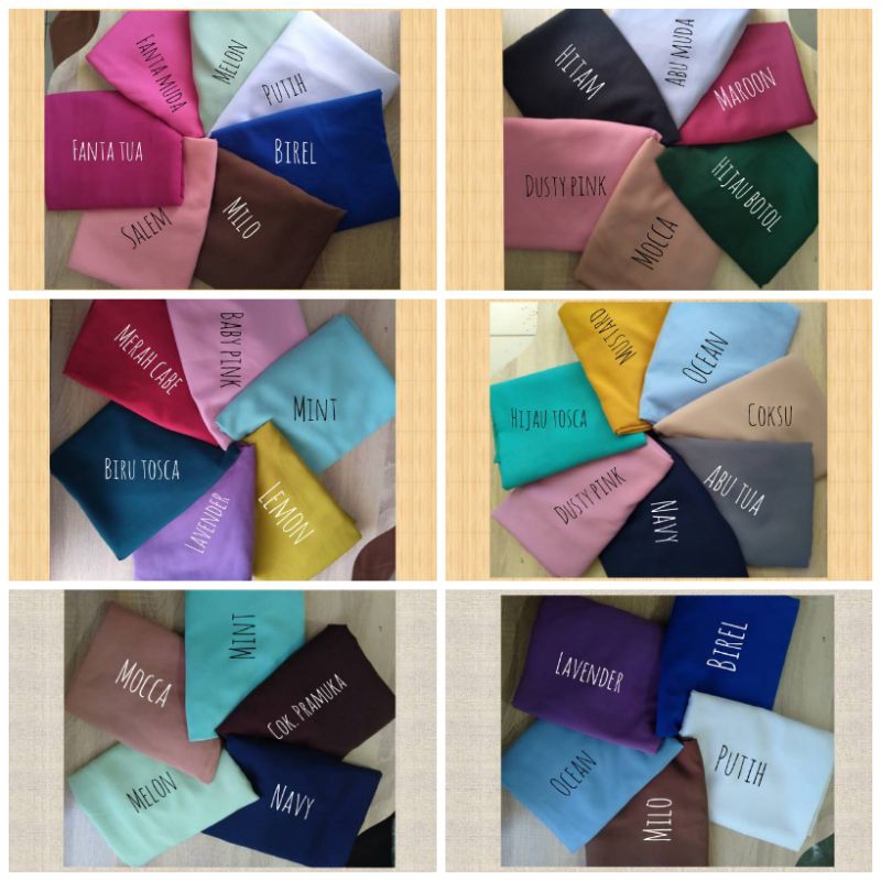 Hitam, Putih, Warna sesuai chat, Nevy, Maroon, Hijau Tua, Lavender, Dusty Pink, Abu Tua, Abu muda, Biru wardah, Hijau wardah, Putih tulang, Hijau toska, Sage tua, Sage muda, Ungu terong, Lilac, Coksu, Mocca, Cokelat Tua, Hijau botol, Mocca tua, Mustard, Milo, Turqis, Biru toska, Toska muda, Muve, Salem, Peach, Mint, Biru mint, Denim, M. Bata, Hijau alpukat, Biru langit, Lemon, Dusty ungu, Biru bca, Crem, Ungu Tua, Pink fanta, Magenta, Olive, Caramel, Latte, Taro, Hazelnut, Hijau NU