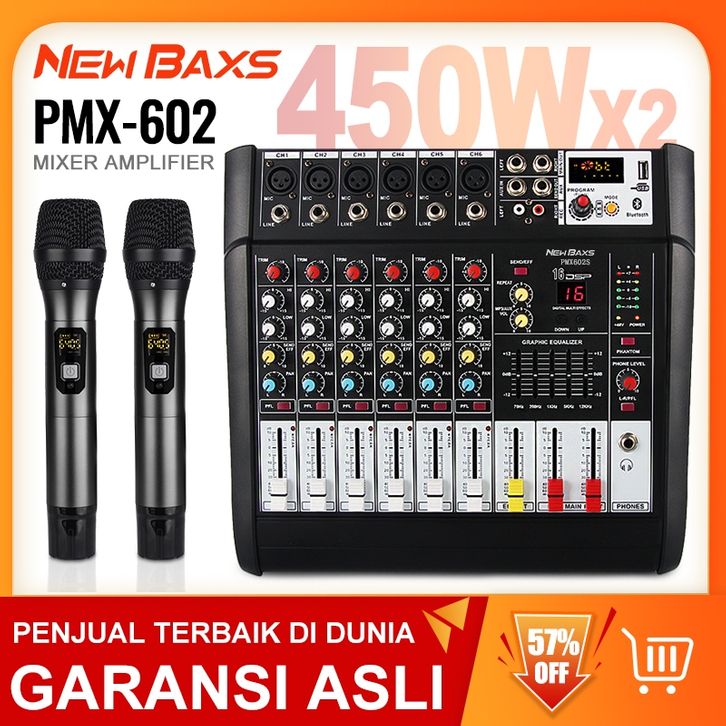 TERLARIS NEW BAXS PMX602 AUDIO MIXER POWER AMPLIFIER WIRELESS MICROPHONE 3 IN 450W DUASALURAN MIXER 6 SALURAN MENDUKUNGP