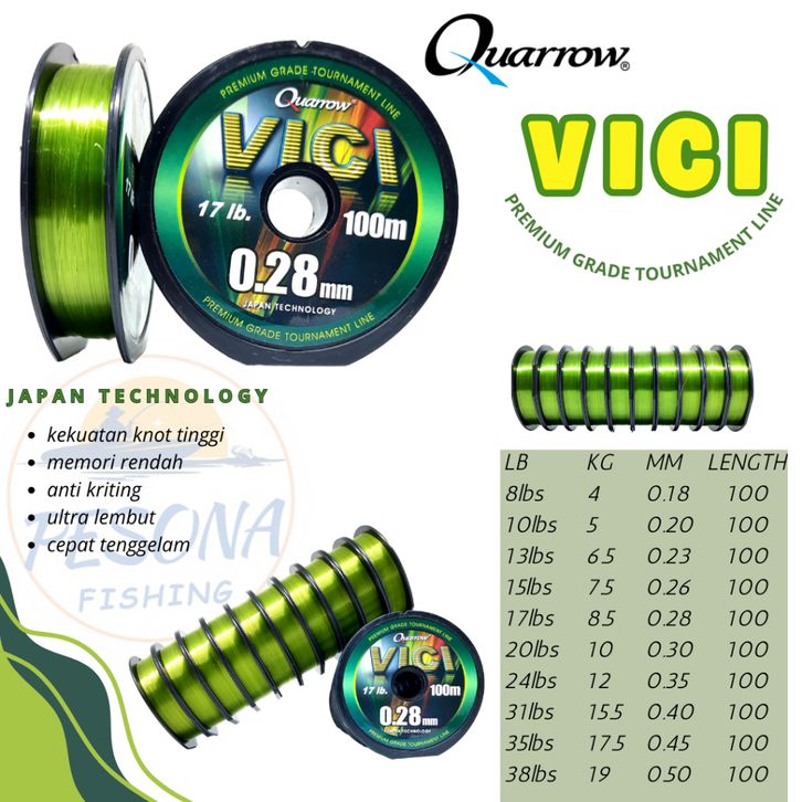 Senar Pancing Quarrow VICI Tournament Warna Hijau Panjang 100 Meter Kuat dan Awet Tahan Keriting