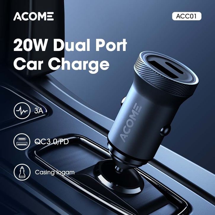 ACOME Car Charger ACC01 Dual Port USB A + Type C PD 20W QC3.0 Colokan Mobil Support Fast Charging