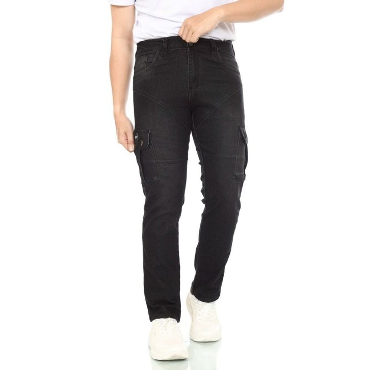 B-FOUR Celana Jeans Cargo Panjang Slimfit Pola Pecah Black Wash Denim Tebal Original Big Size