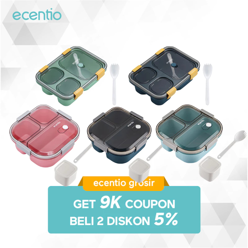 [grosir] ecentio Kotak Makan anti tumpah 3 Grid 850ml/1100ml lunch box Biru/Hijau/Pink tempat makan anti tumpah/disegel Kotak Anti bocor 1100ml+100ml Free Sendok dan toples 100ml/BPA Free
