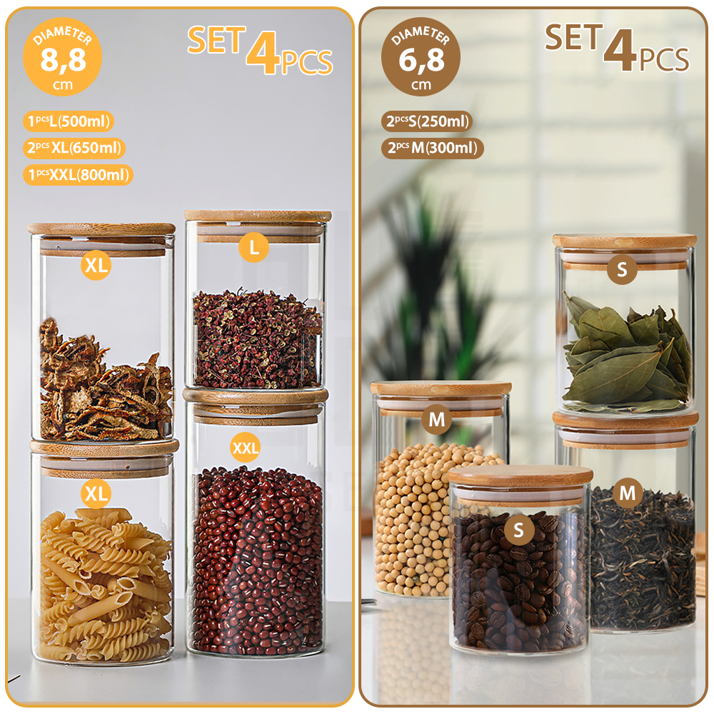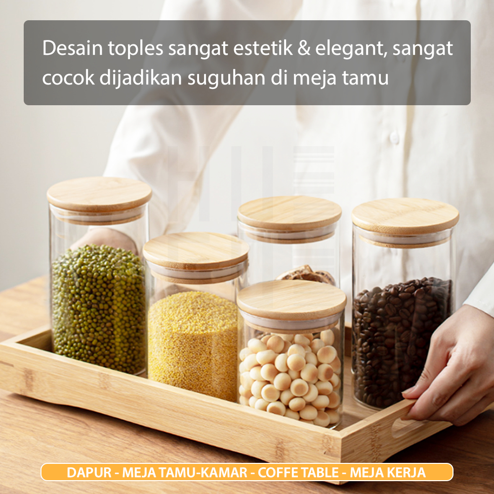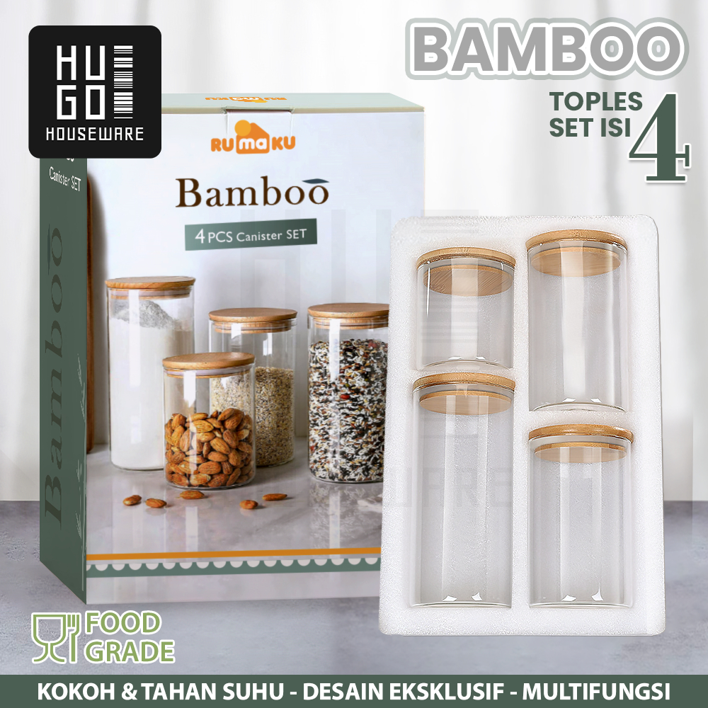 HUGO Toples Kaca Set 4 Pcs Toples Kue Kedap Udara Tutup Bambu Premium Quality Toples Kaca Borosilicate Tahan Panas