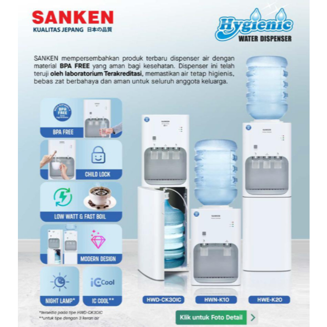 [Mall] SANKEN DISPENSER GALON HWE-K20 - DISPENSER GALON ATAS (HOT, NORMAL, COLD) HWEK20 WARNA PUTIH