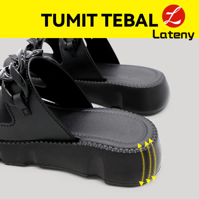 Lateny Sandal Wanita Wedges Karet Jelly Sol Tebal Tali Rantai Hitam