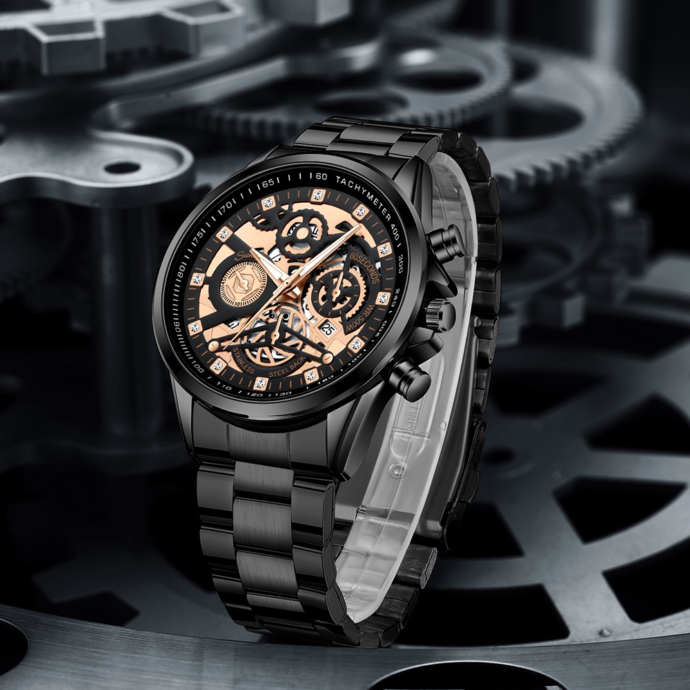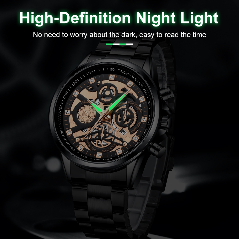 Sunlifex Jam Tangan Pria 3352 Bercahaya Dial Berongga Santai Mode Tali Stainless Steel Kalender Jam Tangan Cowok