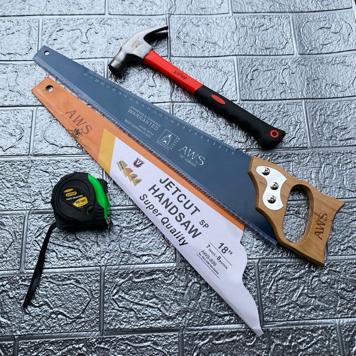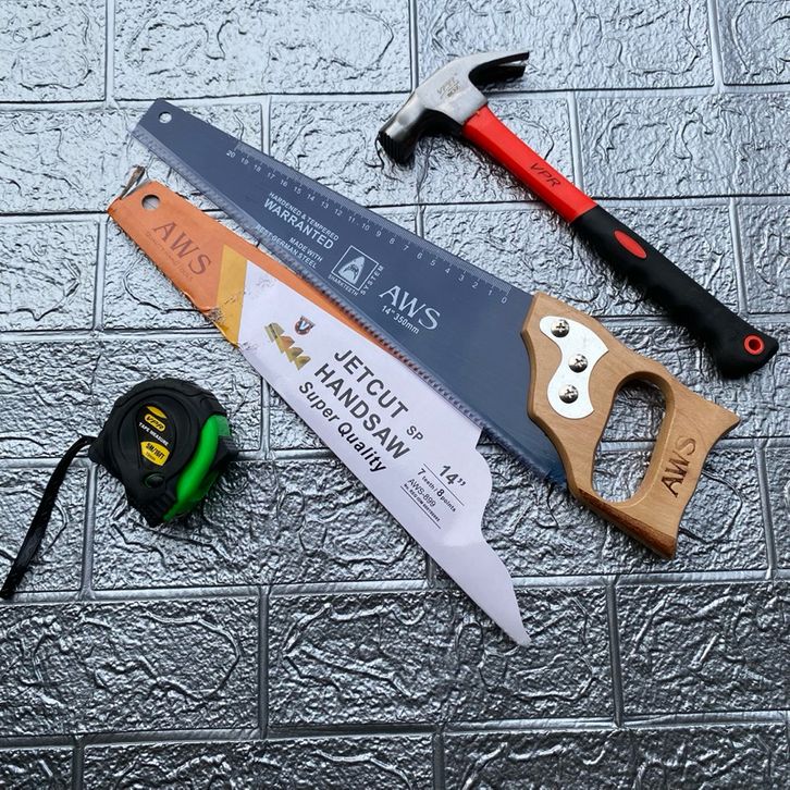Paket 3 Pcs alat Pertukangan Gergaji AWS 14 16 1 inch Meteran 5 M dan Palu 2 in 1 Gagang Fiber