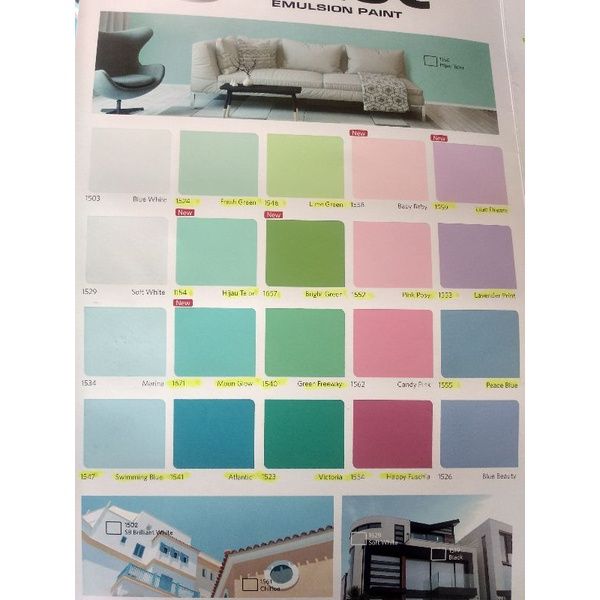 Atlantic, Bright Green, Cafe latte, Candy Pink, Cream, Durian, Goby sand, Graycloth, Green freeway, Happy fuschia, Ivory, Jasmine, Lakestone, Lavender Print, Lily White, Lime Green, Moon Glow, Orange Torch, Peace Blue, Pink Posy, Putih, Sand storm, Sunshine, Swimming Blue, Victoria, blue beauty, chiffon, clear sky, copper Grey, golden honey, hibiscus, hijau telor, lemon, real murado, sky blue, spring vigor, stone grey, vinilex putih