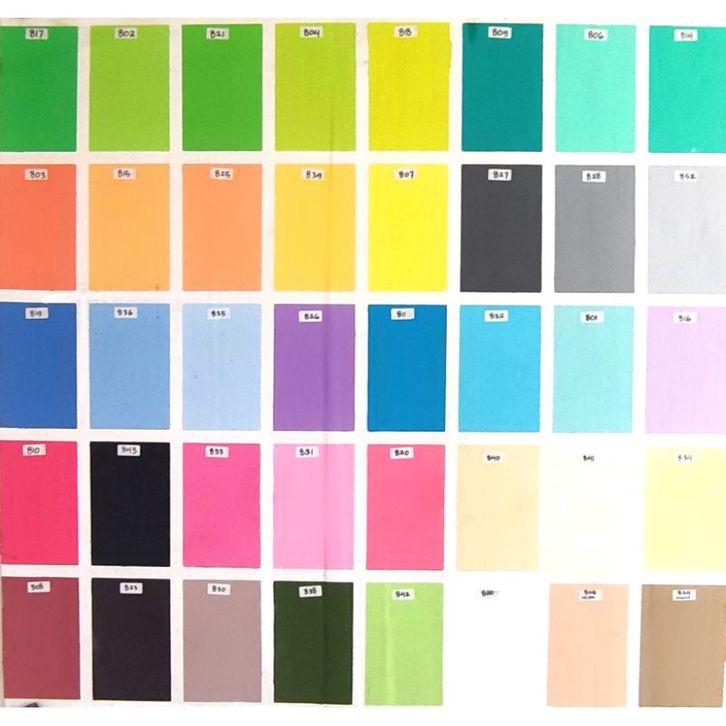 Army(838), Avocado(804), Biskuit(824), Blue doff(819), Candy blue(832), Caroline(809), Ceremei(818), Coklat sedang(856), Coklat tua(823), Dark silver(828), Durian(834), FRESH pink(833), Gading(841), Granite peak(827), Green(817), Hitam(843), ICE blue(835), Kenari(807), Kiwi (842), Krem(840), Kunyit(815), Lavenda(816), Light grey(852), Melon(802), Mocca(830), Mustard(839), Orange(803), Putih tulang, Putih(800), Red coral(808), Rose pink(831), Salem(805), Sky blue(836), Stabilo(821), Sunset(825), Telor asin (801), Tosca muda(806), Tosca(814), Violet(826)