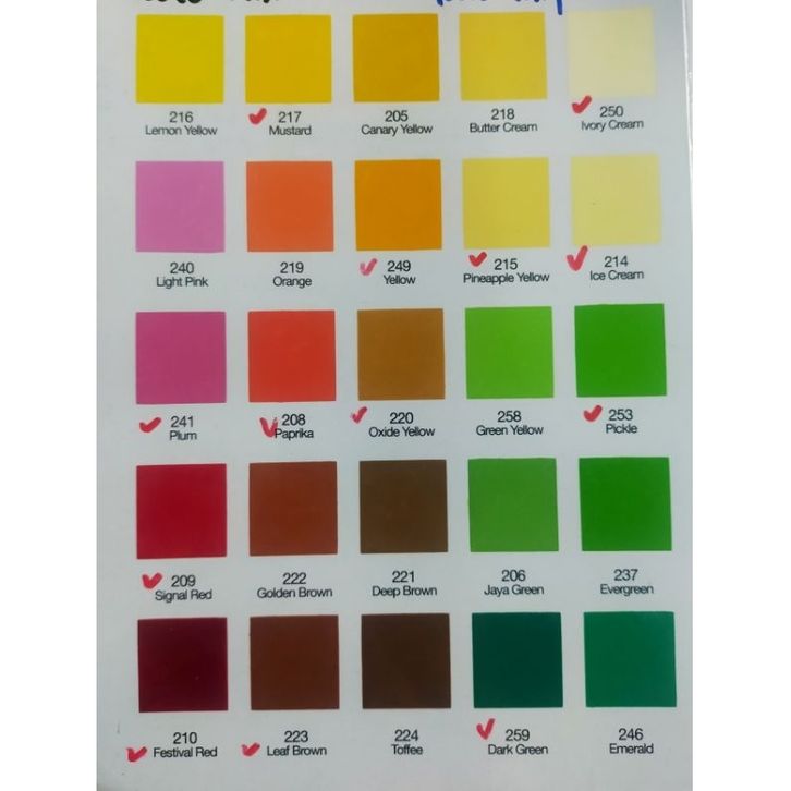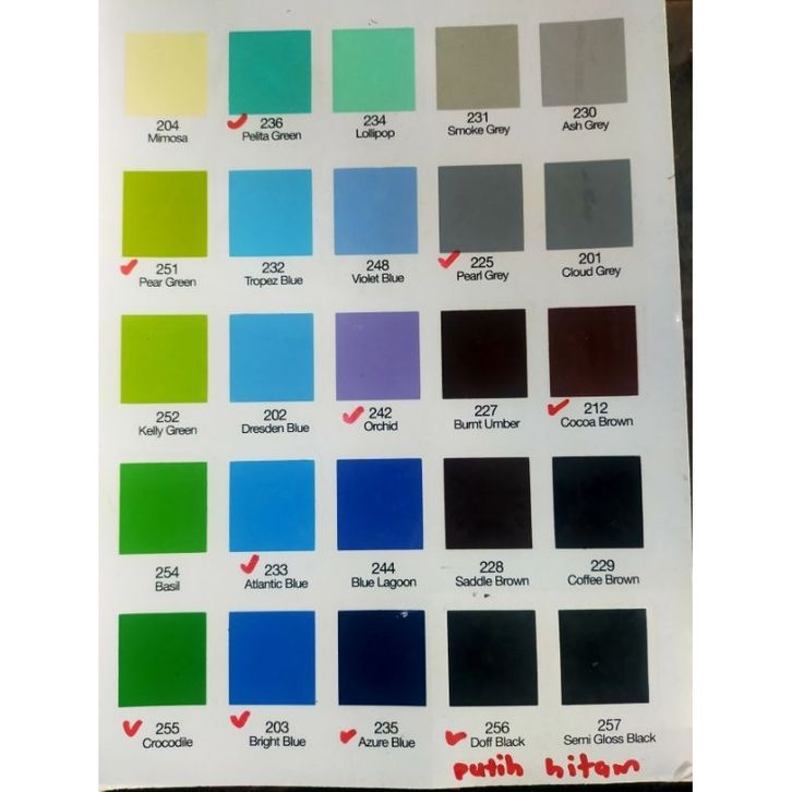 209 signal red, 210 festival red, 223 leaf brown, 225 pearl grey, 235 azure blue, 236 pelita green, 249 yellow, 255 crocodile, hitam, hitam doff, putih