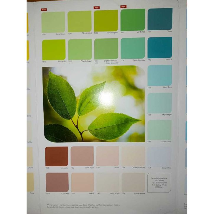 1107 SB Brill White, 1108 Extra White, 1109 Putih Salju, 1114 Blue Berlin, 1116 Cream, 1117 Ivory, 1126 Blewah, 1127 Merah Muda, 1129 Peach, 1131 Orange Torch, 1153 Hijau Segar, 1154 Hijau Telor, 1156 Lime, 1157 Millenium III, 1159 Carnation White, 1161 SG Mist Blue, 1166 Durian, 1167 Victoria, 1168 Blue Beauty, 1170 Candy Flozz, 1171 Goby Sands, 1176 Blue Tile, 1178 Green Freeway, 1179 Atlantic, 1180 Mist Grey, 1181 Raw Silk, 1184 Tang, 1185 Hibiscus, 1186 Cirrus, 1189 Coral Red, 1191 Tosca, 1192 Merry White, 1196 Amber White, 1197 Grass Green, 1198 Lime Fizz, 1515 Barley White, 1546 Lime Green, 1547 Swimming Blue, 1557 Sunshine, 1610 Earth Yellow, 1657 Bright Green, 1660 Lilac Frost, 1672 Candy Pink, 1682 Griseo, 1683 Orange, 1684 Lemon, 1685 Mustard, 1686 Soft Jalapeno, 1688 Real Mocado, 1690 Clear Sky