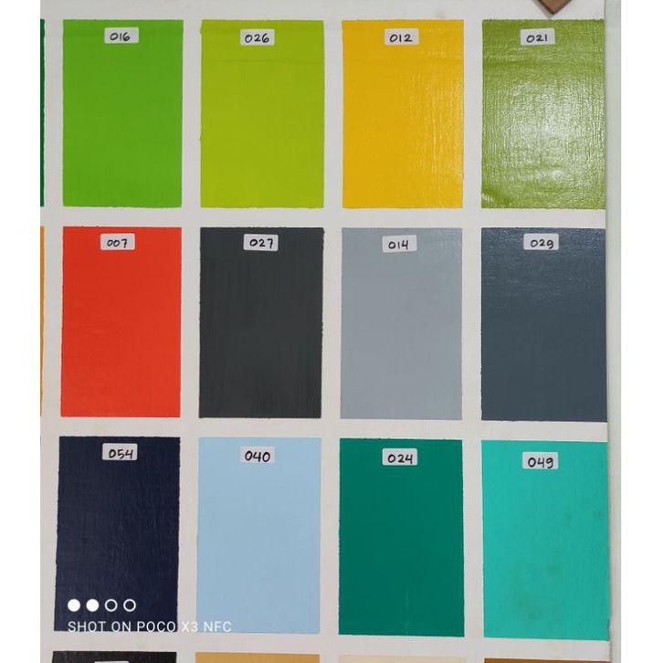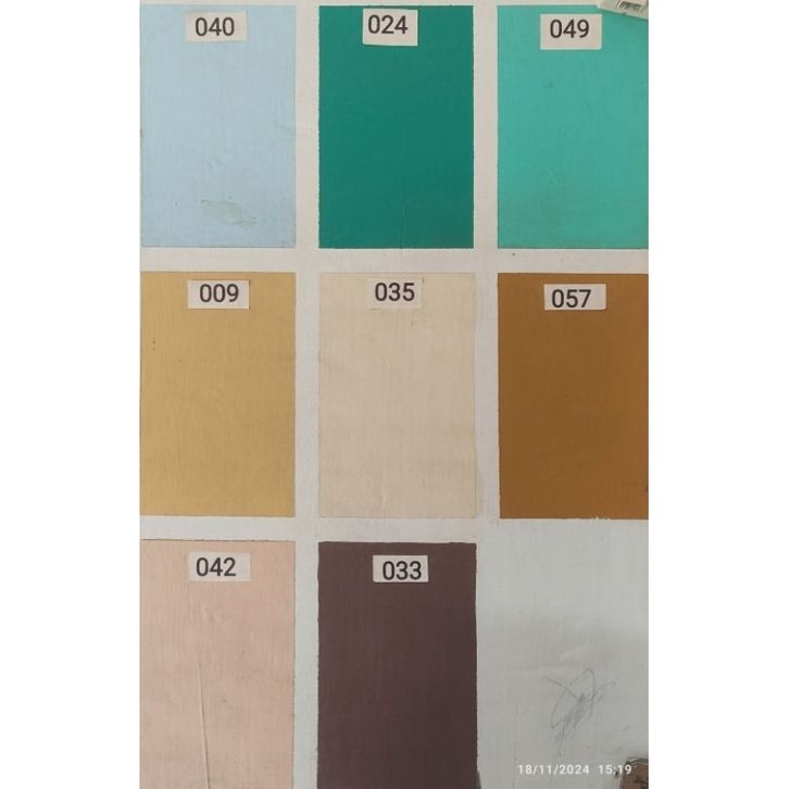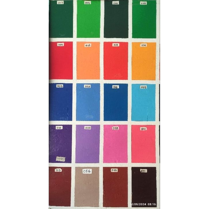 033(coklat kopi), 056(coksu), G 001(coklat tua), G 003(royal blue), G 004(stabilo), G 005(merah), G 006(pinus), G 007(dark orange), G 008(hitam), G 009(krem tua), G 010(indigo), G 012(kuning terang), G 013(maroon), G 014(silver), G 015(biru), G 016(apple), G 017(hijau botol), G 018(orange red), G 020(tawny), G 021(zaitun), G 022(lavender), G 024(hijau toska), G 025(islamic), G 026(buah ceremai), G 027(arang), G 028(orange), G 029(slate grey), G 032(sky blue), G 034(kuning), G 035(krem muda), G 037(biru muda), G 038(magenta), G 040(baby blue), G 041(pink), G 049(mint), G 055(terakota), G 057(goldenrod), G042(salmon), G054(dongker), Glossy 078(putih)