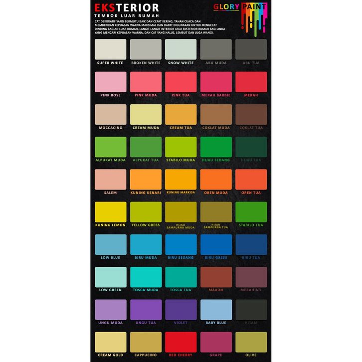 Abu Lembut, Abu Muda, Abu Tua, Alpukat Muda, Alpukat Tua, Biru Gress, Biru Lembut, Biru Muda, Biru Sedang, Biru Tua, Cappucino, Coklat Muda, Coklat Tua, Cream Gold, Cream Muda, Cream Tua, Dolphin Grey, Hijau Bolu Pandan, Hijau Sage, Hijau Sedang, Hijau Tua, Hitam, Kuning, Kuning Kenari, Kuning Lemon, Kuning Markisa, Lilac, Low Blue, Low Green, Marun, Merah, Merah Ati, Merah Barbie, Moccacino, Olive, Oren Muda, Oren Tua, Pink Muda, Pink Rose, Pink Tua, Putih Super, Salem, Stabilo Muda, Stabilo Tua, Tosca Muda, Tosca Tua, Ungu Muda, Ungu Tua, Violet, Yellow Gress