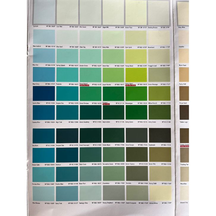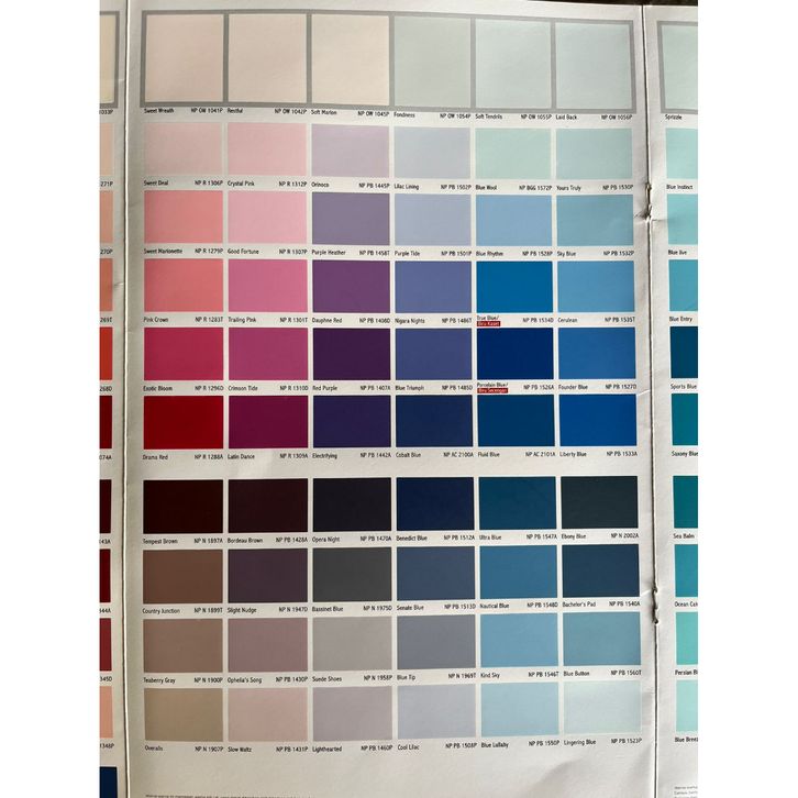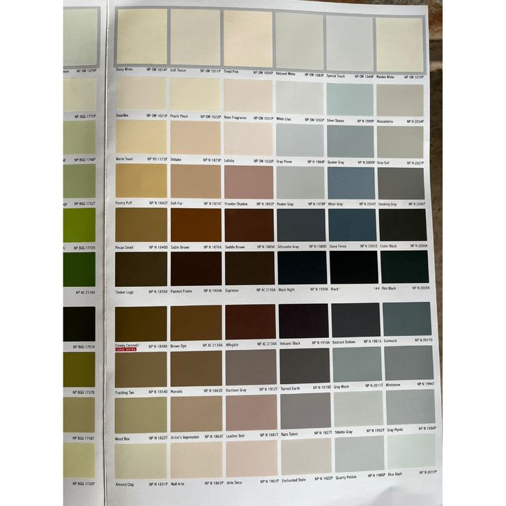 1003P Hush White, 1010P Walden White, 1011P Soft Tissue, 1022P Peach Pinch, 1050P White Lilac, 1083P Reticent White, 1128D Yellow Flag, 1173P Warm Toast, 1185P Crepe De Chine, 1271P Home Sweet Hom, 1379A Red Earth, 1407A Red purple, 145 White, 1503 Blue White, 1534D True Blue, 1560T Blue Button, 1574T Blue Entry, 1752T Green Montage, 1754P Wavelike, 1759T Sweet Escapade, 1766P Young Shepherd, 1822T Wood Box, 1831P Almond Chip, 1846P Ciabatta, 1864T, 1866P Old Pub, 1873P Shitake, 1892P Frontier Shado, 1978P Pewter Gray, 1989D Silhoutte Gray, 2004T Miner Gray, 2009A Flint Black, 2011T Gray Block, 2045T Smoking Gray, 2080A Pink Floss, 2106A Great Seascape, 2107A Tempest Sea, 2135A Expresso, 2144A New Terracota, 2242P Apple White, 2316P My Sweetheart, 2329P Lightly Pink, 2772P Rhyme and Reas, 2947D Night Bloom, 3191T, 3404T Desert Dusk, 607 Broken White, Confire Rose, NP N 3409 Suited Up, Orchid White