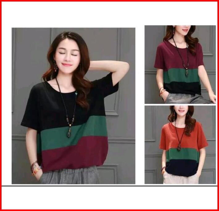 Kaos Wanita Lengan Pendek Model Casual Terbaru Kombinasi Tiga Warna