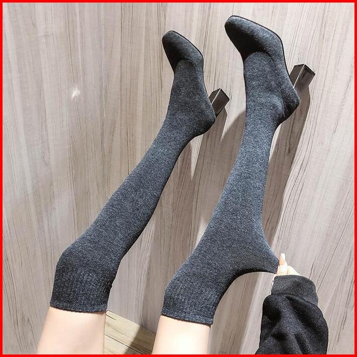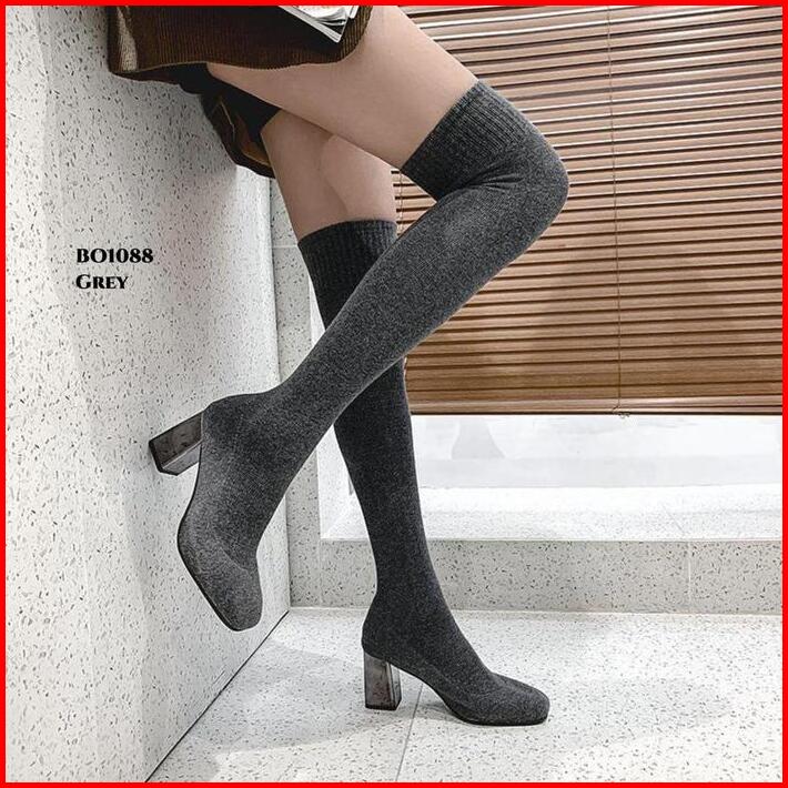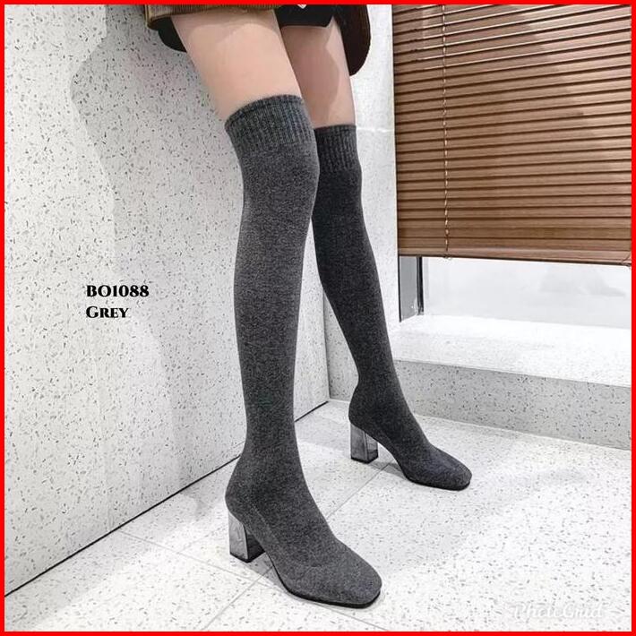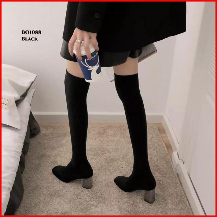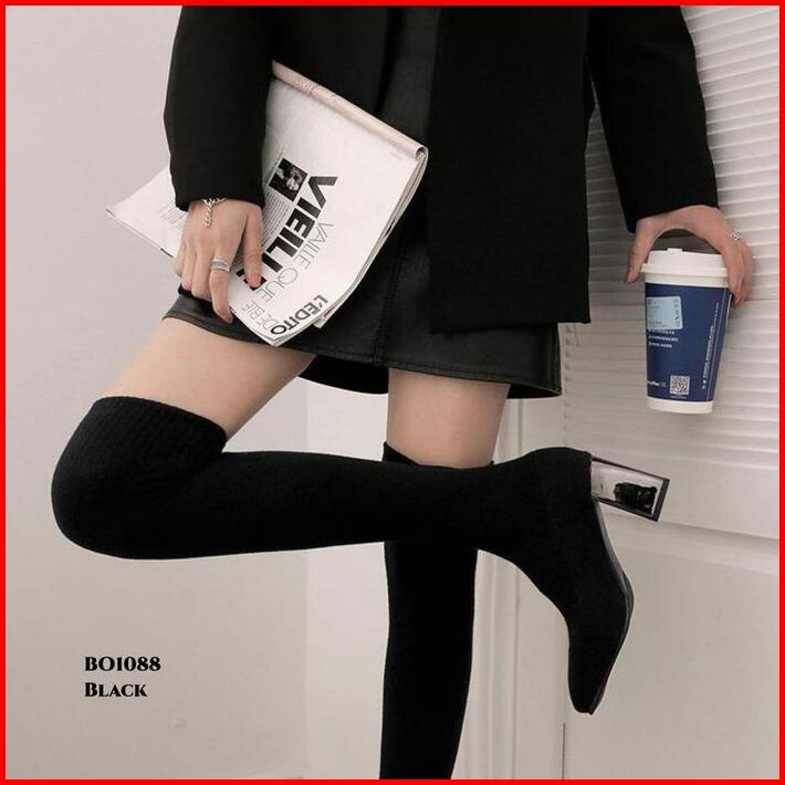 Pinkey P051 Sepatu Tinggi Long Boots Flat Fashion Black Canvas Shoes Wanita