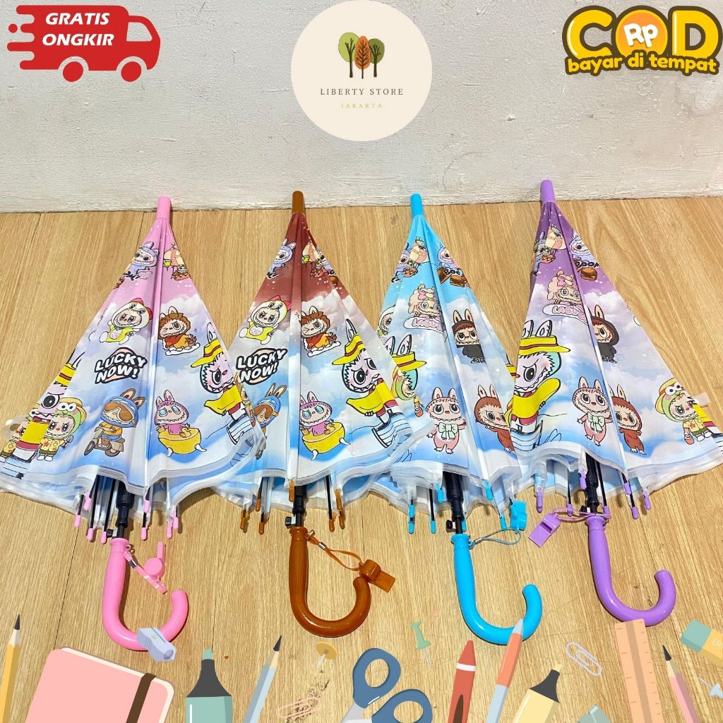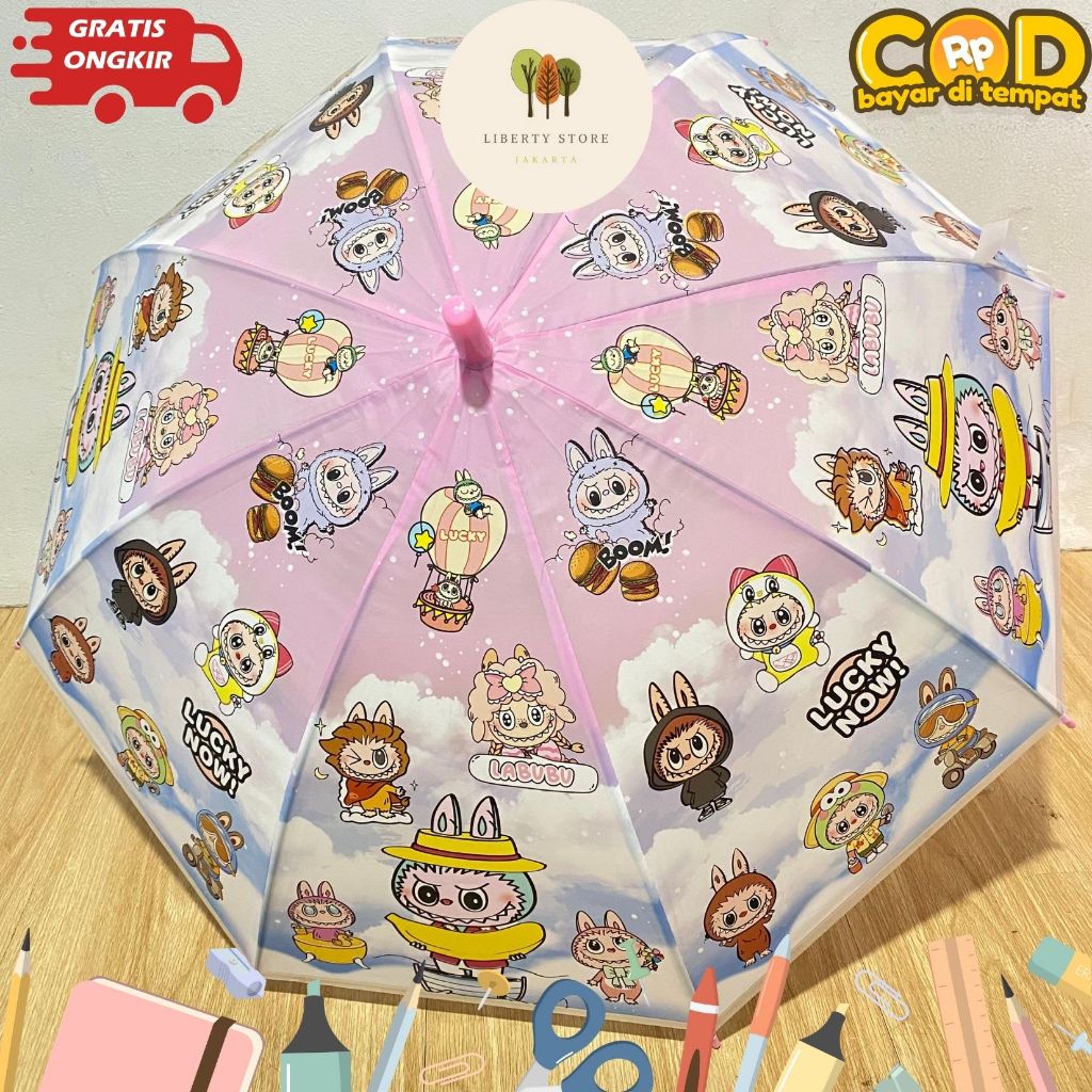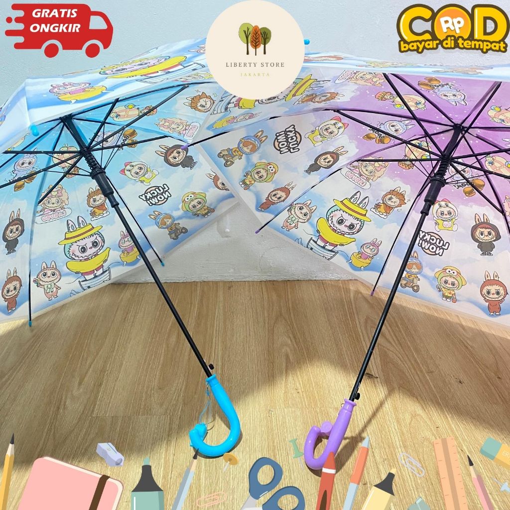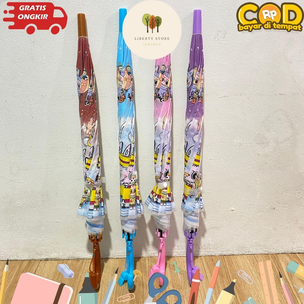 Payung Panjang Anak Labubu Diameter 100cm MN-1702 Free Pluit Karakter Labubu Payung Lucu Fancy