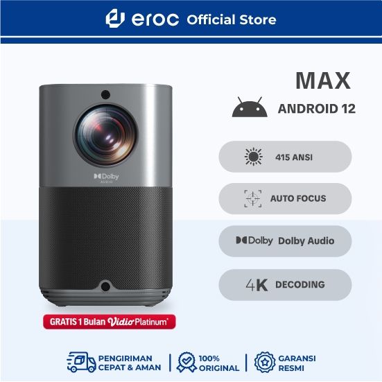 TERLARIS EROC SMART PROYEKTOR LCD 415 ANSI FULL HD ANDROID 12 DOLBY AUDIO DISPLAY 200 INCH AUTO FOCUS -MAX