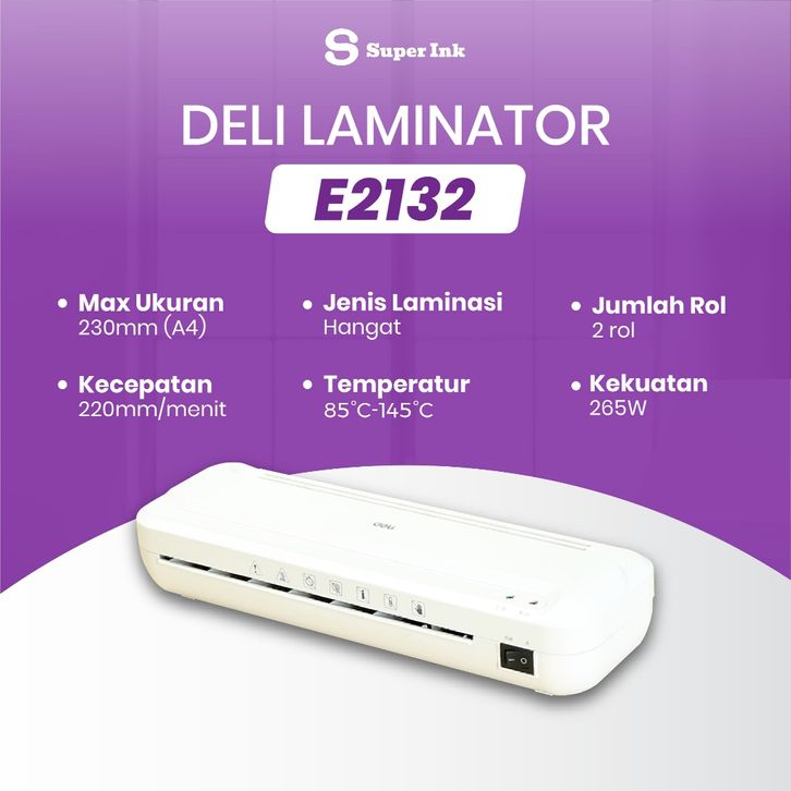 TERLARIS LAMINATOR A4 DELI E2132 DENGAN WAKTU PANAS 5 MENIT, PLASTIK 70–100 µM, SUARA ≤55 DB & FUN REVERSE