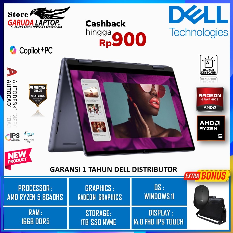 LAPTOP TOUCHSCREEN 2IN1 DELL INSPIRON 14 7445 AMD RYZEN 5 8640HS RAM 32GB DDR5 1TB SSD FHD IPS WIN11 ORI