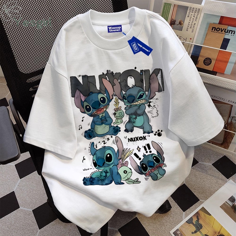 YESGIRL AMERICAN RETRO STYLE CARTOON STITCH PRINT KAOS KASUAL LONGGAR| KAOS OVERSIZE WANITA | FASHION KOREAN STYLE BAJU KAOS OVERSIZE| BAJU ATASAN WANITA TERBARU 100COTTON | KAOS PUTIH WANITA | 6.26