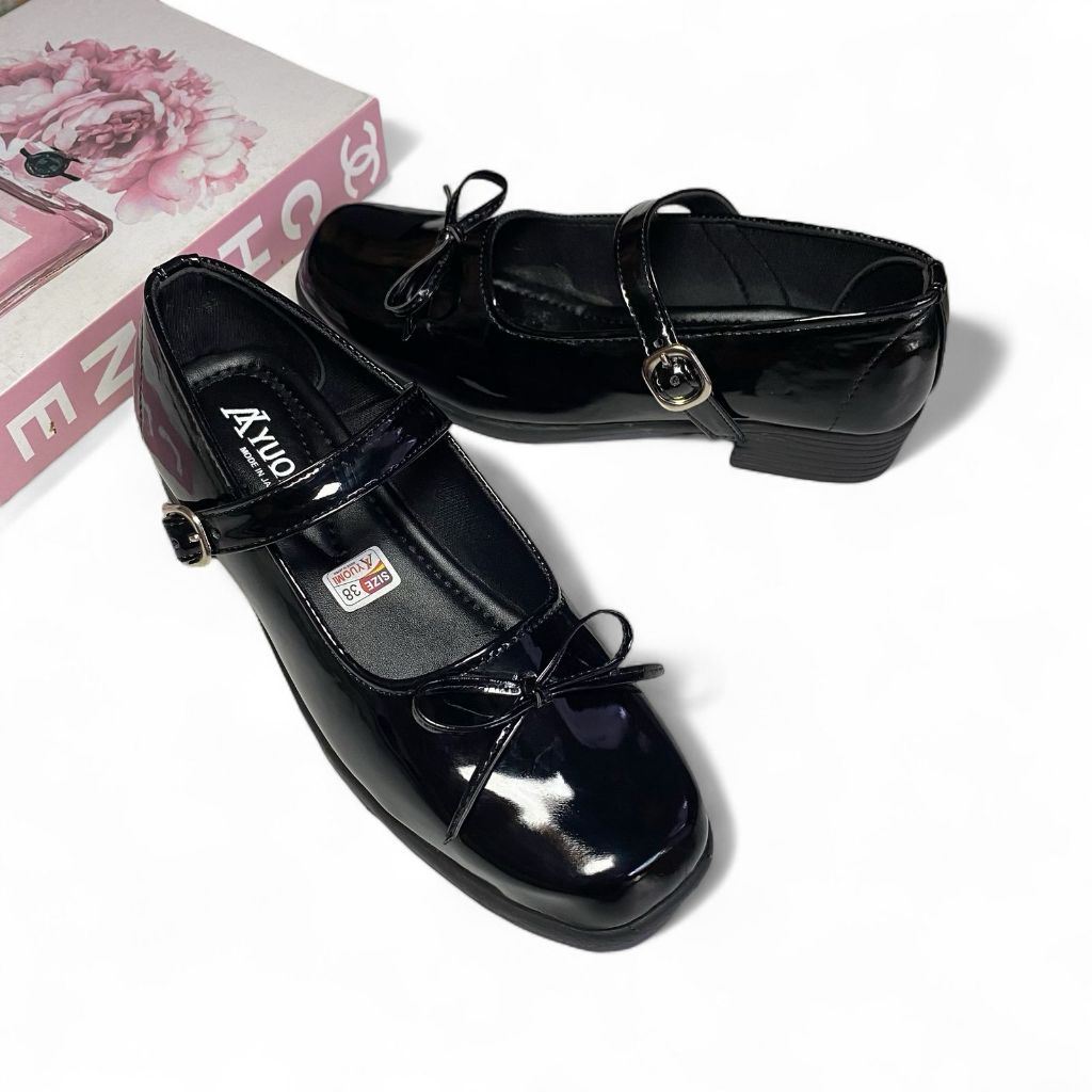 YUOMI SEPATU PANTOFEL WANITA PASKIBRA HITAM GLOSSY GESPER HAK 3CM