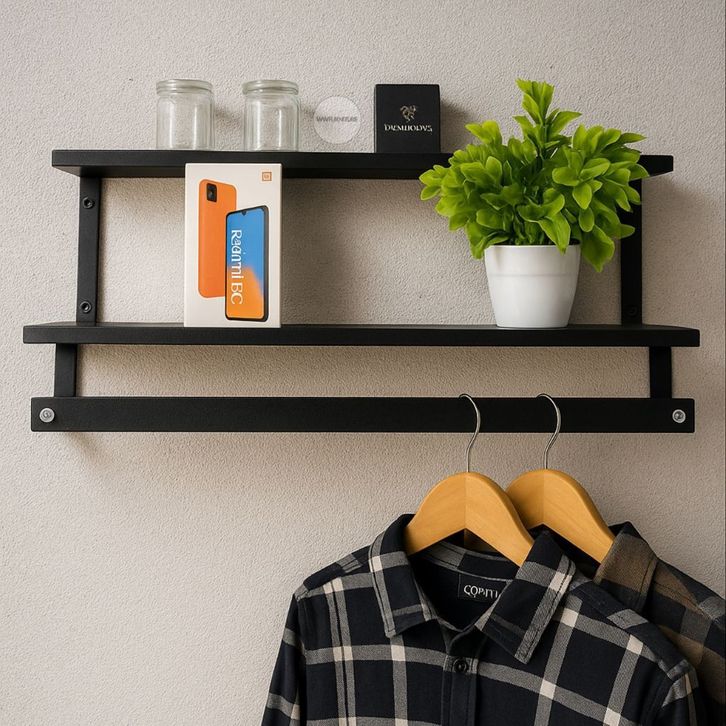 Rak Gantungan Baju Dinding 2 Tingkat Minimalis – Rak Tempel Kayu Besi Serbaguna